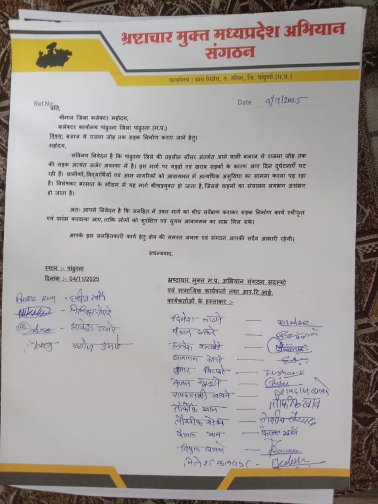 पांढुरना – भ्रष्टाचार मुक्त मध्यप्रदेश अभियान संगठन ने जिला कलेक्टर महोदय को ज्ञापन भेजकर बजाज से राजना जोड़ तक की सड़क के निर्माण की मांग की है। संगठन का कहना है कि यह मार्ग अत्यंत जर्जर अवस्था में पहुँच चुका है, जिसके कारण आए दिन दुर्घटनाएँ घट रही हैं और आमजन को भारी परेशानी का सामना करना पड़ रहा है।