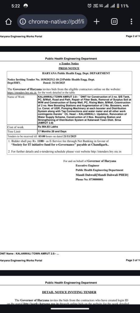 कालांवाली मे लंबे इंतज़ार के बाद आखिरकार कालांवाली नगर की जलापूर्ति व्यवस्था को सुदृढ़ करने की दिशा में बड़ा कदम उठाया गया है। हरियाणा जन स्वास्थ्य अभियांत्रिकी विभाग ने अमृत 2.0 योजना के तहत ₹904.83 लाख की लागत से कालांवाली नगर के जलापूर्ति प्रोजेक्ट का टेंडर जारी कर दिया है। यह निविदा सूचना संख्या 1030202512-18-23 दिनांक 31 अक्टूबर 2025 को जारी की गई है।