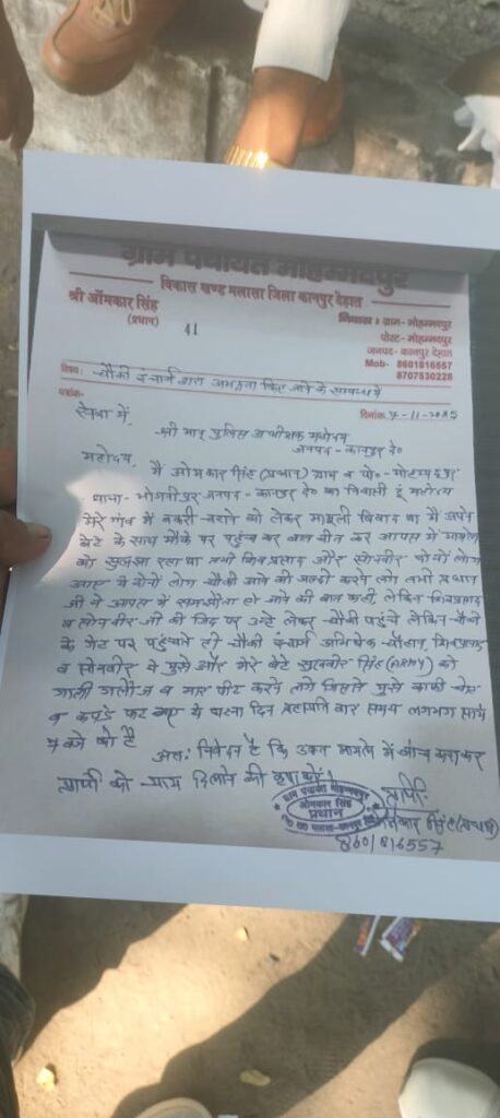 जिससे मुझे हाथ में चोट आई मारपीट में मेरे कपड़े फट दिए गए । यह घटना दिन बृहस्पतिवार समय लगभग शाम 7:00 बजे की है । इस पूरे मामले से पुलिस अधीक्षक कानपुर देहात को अवगत कराया गया। देवीपुर पुलिस चौकी में हुई पूरी घटना का संज्ञान लेकर ग्राम प्रधान ओमकार सिंह ने न्याय की मांग की है । सुखबीर सिंह फौजी ने बताया कि पांडे जी ने जांच कराकर उचित कार्यवाही कराने का आश्वासन दिया है। इस दौरान प्रधान संघ के अध्यक्ष हरजीत सिंह यादव , संजय सचान सदस्य जिला पंचायत बरौर , ओमप्रकाश बाबा डॉ भीमराव अंबेडकर सेवा समिति मोहम्मदपुर अध्यक्ष , गुलाब सिंह बूथ सेक्टर अध्यक्ष बहुजन समाज पार्टी मलासा , प्रदीप सचान , राम प्रकाश ग्राम प्रधान , सुखबीर सिंह फौजी , सिपाही लाल डॉक्टर भीमराव अंबेडकर सेवा समिति मोहम्मदपुर सचिव आदि लोग मौके पर मौजूद रहे ।