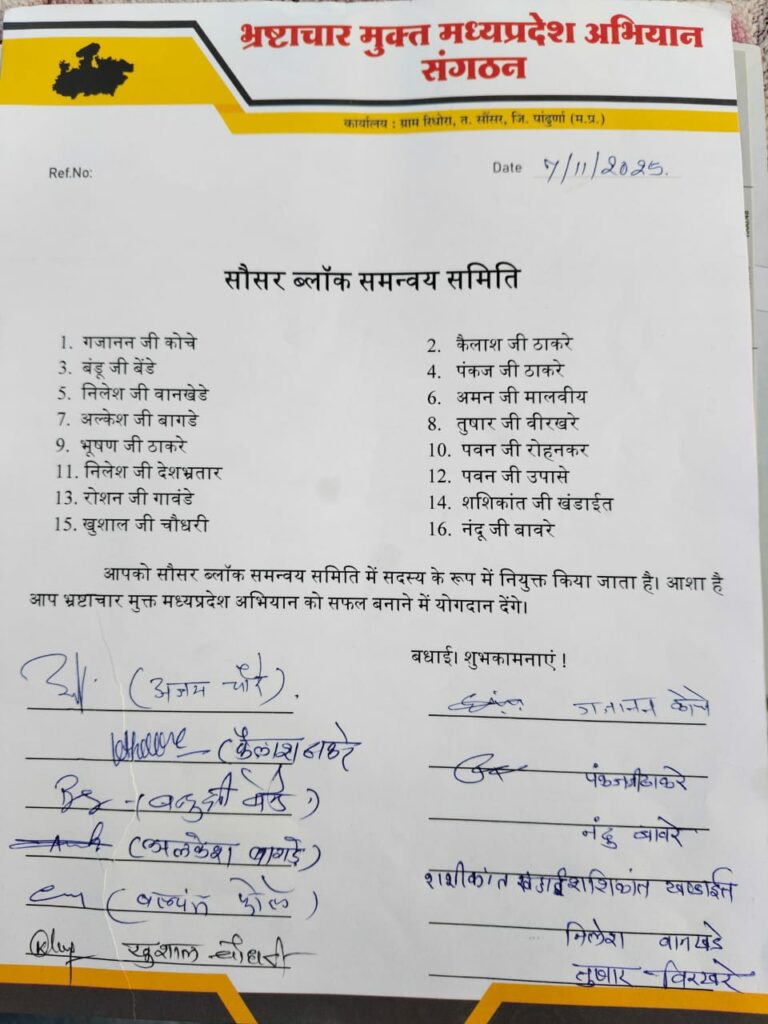 पांढुरना/सौसर -जनहित, समाज सेवा और सुशासन के उद्देश्य को साकार करने के लिए भ्रष्टाचार मुक्त मध्य प्रदेश संगठन – सौसर इकाई के अंतर्गत नई टीम का गठन किया गया। संगठन के वरिष्ठ पदाधिकारियों, गणमान्य नागरिकों एवं कार्यकर्ताओं की सर्वसम्मति से यह नियुक्तियाँ की गईं।