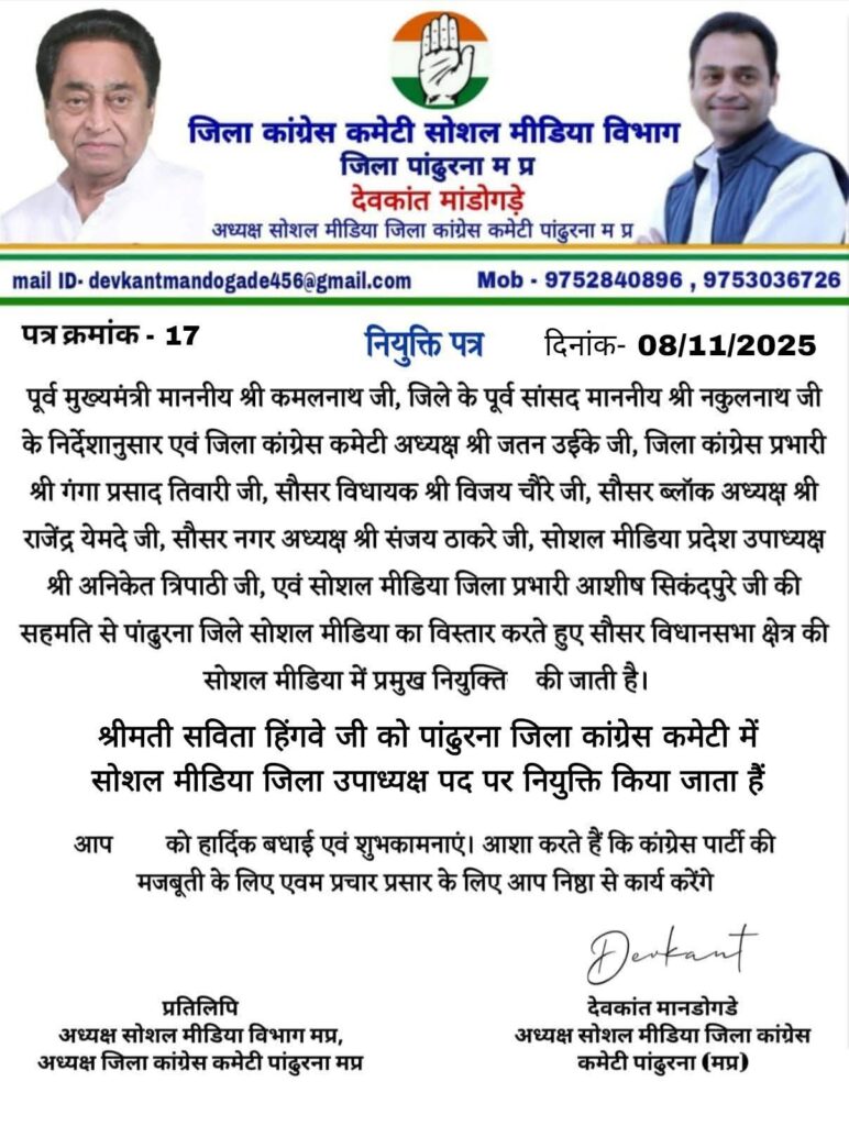 श्रीमती सविता हिंगवे बनीं पांढुरना जिला कांग्रेस सोशल मीडिया उपाध्यक्ष