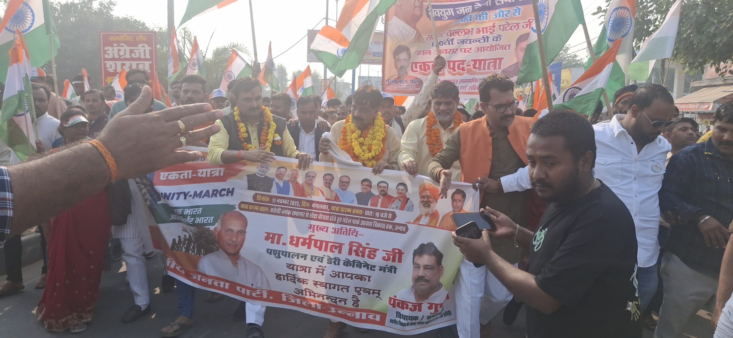 सरदार वल्लभ भाई पटेल जी की 150 वीं जयंती के उपलक्ष्य में आयोजित एकता यात्रा UNITY MARCH सरोसी ब्लॉक सभागार से होते हुए शेखपुरा नहर पहुंचे जहां पर उन्नाव के युवा भाजपा नेता कुंवर विनय सिंह वा उन्नाव के सैकड़ो युवा साथियों ने मुख्य अतिथि के रूप में पशुपालन एवं डेरी कैबिनेट मंत्री मा. धर्मपाल सिंह जी के साथ सदर विधायक आदरणीय पंकज गुप्ता जी के नेतृत्व में निकली एकता यात्रा का स्वागत करते हुए शहर के छोटे चौराहा, मोती नगर होते हुए कृष्णा नगर पटेल पार्क आवास विकास कॉलोनी तक पद यात्रा करते हुए पटेल पार्क पर यात्रा का समापन हुआ।