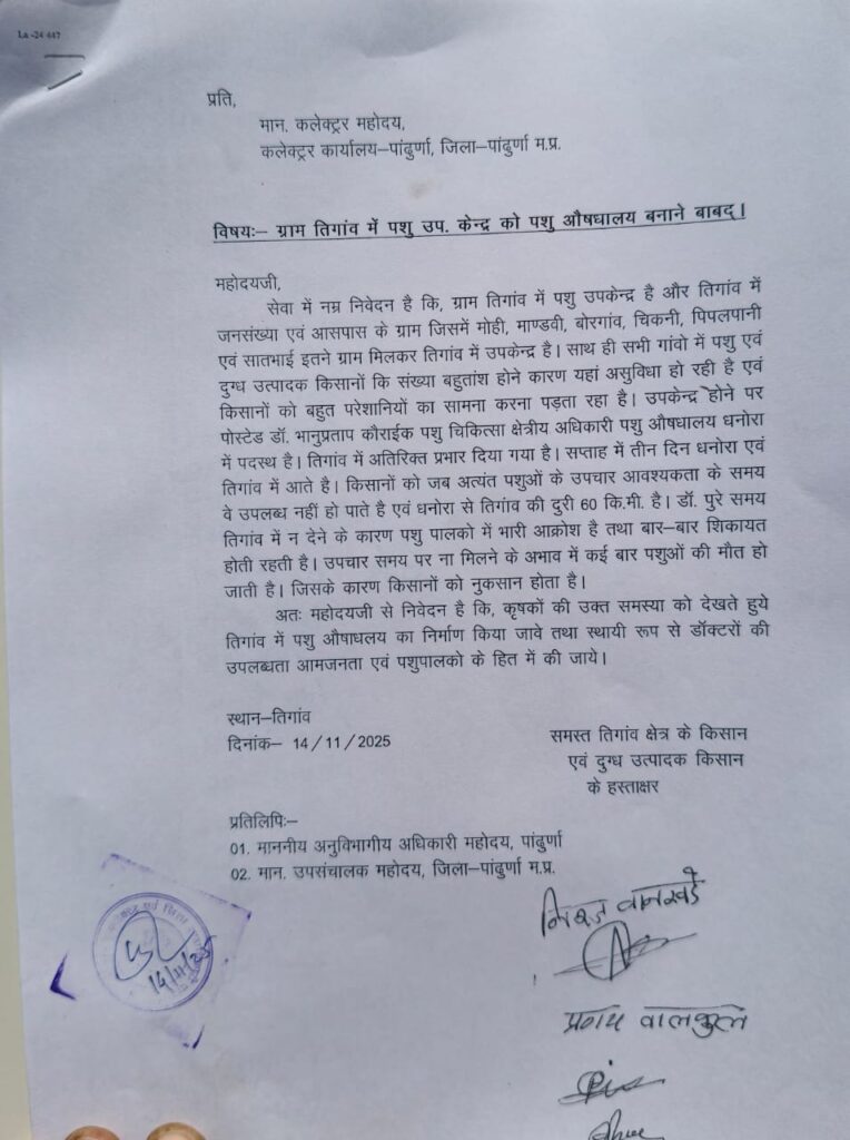 पांढुरना – ग्राम तिगांव के किसानों और पशु पालकों ने कलेक्टर को ज्ञापन सौंप कर तिगांव में स्थायी पशु चिकित्सालय और पशु चिकित्सक की नियुक्ति की मांग की है। ग्राम तिगांव में पशुपालक किसानों ने पशु चिकित्सा व्यवस्था को लेकर गंभीर असंतोष व्यक्त किया है। ग्राम तिगांव में पशु उपकेन्द्र तो है, लेकिन डॉक्टर की अनुपलब्धता के कारण किसानों को भारी परेशानियों का सामना करना पड़ रहा है। किसानों ने प्रशासन से तत्काल पशु औषधालय के निर्माण और स्थायी डॉक्टर की नियुक्ति की मांग उठाई है।