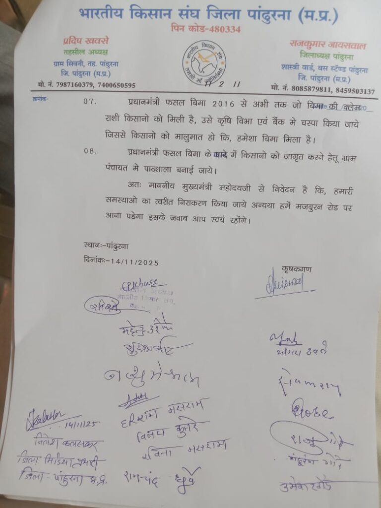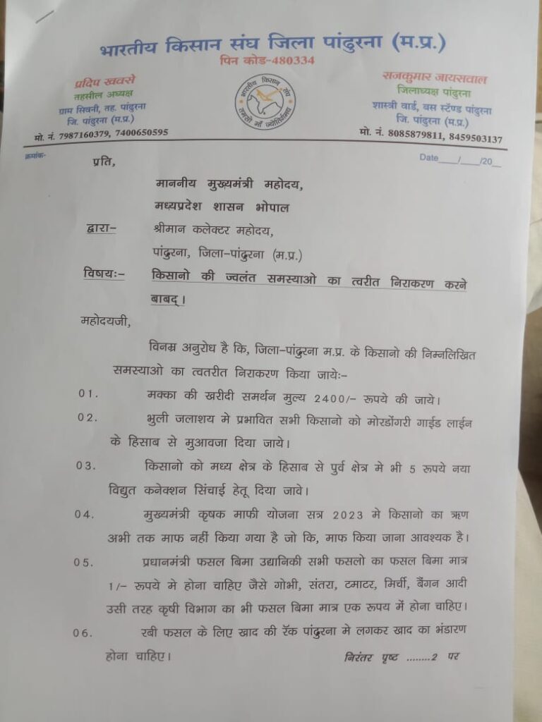 पांढुरना – भारतीय किसान संघ (भाकिसं), जिला पांढुरना ने आज जिला प्रशासन के माध्यम से मुख्यमंत्री, मध्य प्रदेश शासन को एक कड़ा ज्ञापन सौंपकर किसानों की आठ सूत्रीय मांगों पर तत्काल कार्रवाई की मांग की है। संघ ने चेतावनी दी है कि यदि समस्याओं का शीघ्र निराकरण नहीं किया गया, तो किसान बड़े आंदोलन के लिए मजबूर होंगे।