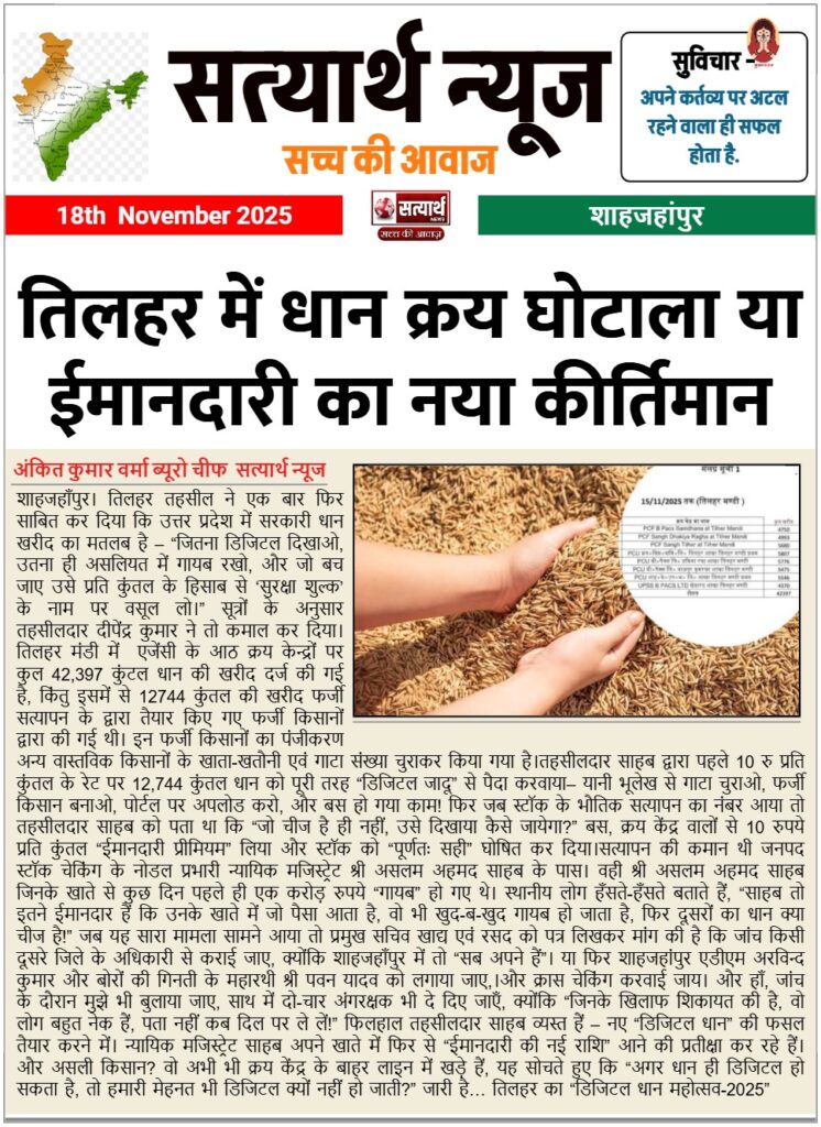 #शाहजहाँपुर। तिलहर तहसील ने एक बार फिर साबित कर दिया कि उत्तर प्रदेश में सरकारी धान खरीद का मतलब है – “जितना डिजिटल दिखाओ, उतना ही असलियत में गायब रखो, और जो बच जाए उसे प्रति कुंतल के हिसाब से ‘सुरक्षा शुल्क’ के नाम पर वसूल लो।” सूत्रों के अनुसार तहसीलदार दीपेंद्र कुमार ने तो कमाल कर दिया। तिलहर मंडी में एजेंसी के आठ क्रय केन्द्रों पर कुल 42,397 कुंटल धान की खरीद दर्ज की गई है, किंतु इसमें से 12744 कुंतल की खरीद फर्जी सत्यापन के द्वारा तैयार किए गए फर्जी किसानों द्वारा की गई थी। इन फर्जी किसानों का पंजीकरण अन्य वास्तविक किसानों के खाता-खतौनी एवं गाटा संख्या चुराकर किया गया है।तहसीलदार साहब द्वारा पहले 10 रु प्रति कुंतल के रेट पर 12,744 कुंतल धान को पूरी तरह “डिजिटल जादू” से पैदा करवाया– यानी भूलेख से गाटा चुराओ, फर्जी किसान बनाओ, पोर्टल पर अपलोड करो, और बस हो गया काम! फिर जब स्टॉक के भौतिक सत्यापन का नंबर आया तो तहसीलदार साहब को पता था कि “जो चीज है ही नहीं, उसे दिखाया कैसे जायेगा?” बस, क्रय केंद्र वालों से 10 रुपये प्रति कुंतल “ईमानदारी प्रीमियम” लिया और स्टॉक को “पूर्णतः सही” घोषित कर दिया।