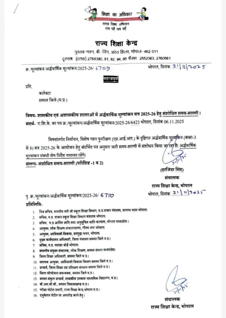 राज्य शिक्षा केन्द्र के संचालक श्री हरजिंदर सिंह द्वारा जारी आदेश में बताया गया है कि इन दिनों प्रदेशभर में SIR प्रक्रिया (Special Intensive Revision / मतदाता सूची पुनरीक्षण प्रक्रिया) में शासकीय कर्मचारियों की व्यापक भागीदारी आवश्यक होने के कारण विद्यालयीन मूल्यांकन कार्य की तिथियों में संशोधन किया गया है।