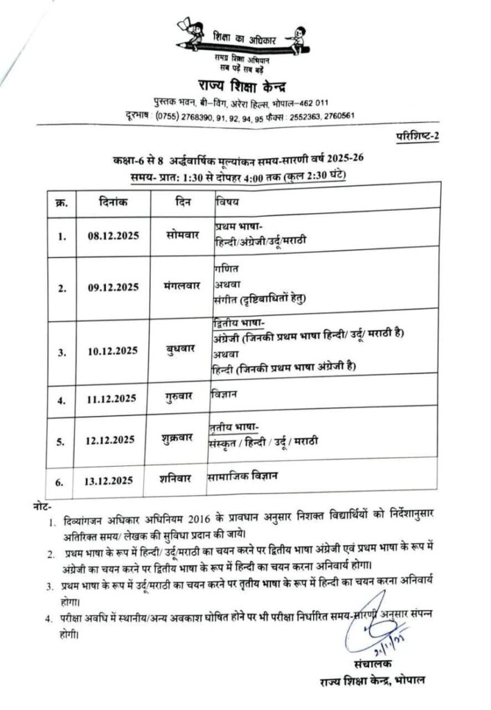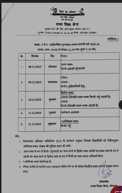 पांढुरना – प्रदेश की शासकीय एवं अशासकीय विद्यालयों में कक्षा 3 से 8 तक आयोजित होने वाली अर्धवार्षिक परीक्षाओं की तिथियों में परिवर्तन किया गया है। यह मूल्यांकन पूर्व निर्धारित कार्यक्रम के अनुसार 24 नवम्बर से शुरू होना था, किंतु अब इसे आगे बढ़ाते हुए 8 दिसंबर से 13 दिसंबर 2025 के मध्य आयोजित किया जाएगा।