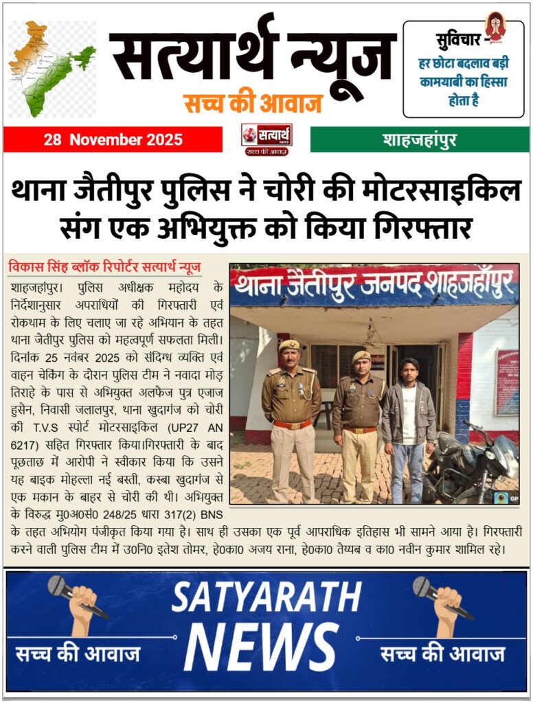 शाहजहांपुर। पुलिस अधीक्षक महोदय के निर्देशानुसार अपराधियों की गिरफ्तारी एवं रोकथाम के लिए चलाए जा रहे अभियान के तहत थाना जैतीपुर पुलिस को महत्वपूर्ण सफलता मिली। दिनांक 25 नवंबर 2025 को संदिग्ध व्यक्ति एवं वाहन चेकिंग के दौरान पुलिस टीम ने नवादा मोड़ तिराहे के पास से अभियुक्त अलफैज पुत्र एजाज हुसैन, निवासी जलालपुर, थाना खुदागंज को चोरी की T.V.S स्पोर्ट मोटरसाइकिल (UP27 AN 6217) सहित गिरफ्तार किया।