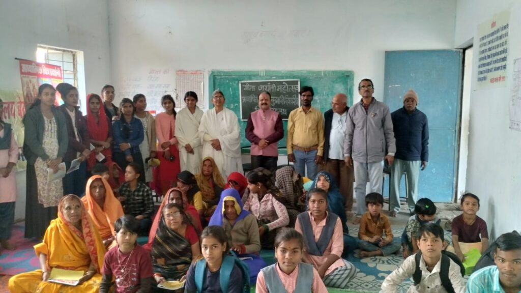 कौशल्या दीदी द्वारा बहुत ही सरल, सहज एवं मधुर भाषा में चित्र प्रदर्शनी के माध्यम से गीता सार को स्पष्ट किया गया। लोगों को गीता के अनुसार जीवन जीने की प्रेरणा प्रदान की। साथ ही प्रजापिता ईश्वरीय विश्वविद्यालय ब्रह्माकुमारी संस्था के द्वारा किए जा रहे कार्यों की जानकारी प्रदान की। अंत में आभार व्यक्त संस्था प्रमुख द्वारा किया गया। प्रसादी वितरण के साथ कार्यक्रम का समापन हुआ। कार्यक्रम में संस्था के विद्यार्थी , स्कूल स्टाफ, एवं बहुसंख्यक ग्रामीण महिला पुरुष उपस्थित रहे।