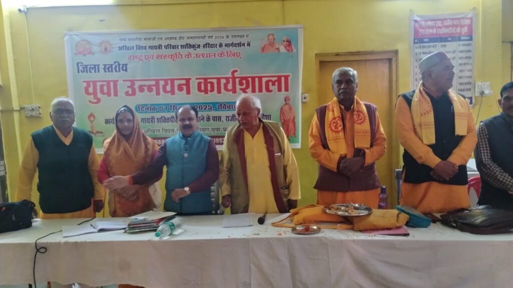 राष्ट्रीय मीडिया प्रभारी अखिल भारतीय स्वर्णकार महासभा एवं गायत्री साधक लायन अरुण कुमार सोनी ने बताया कि पूर्व सूचना दिनांक 22/ 11/ 20 25 के अनुसार आज दोपहर 1:00 बजे गायत्री शक्तिपीठ विदिशा में मुख्य प्रबंध ट्रस्टी श्री राम कटियार की अध्यक्षता में बैठक सर्वप्रथम पूजा, अर्चन एवं वंदन के पश्चात सामूहिक गायत्री महामंत्र के साथ प्रारंभ की गई। इस बैठक में भोपाल से पधारे जोन पदाधिकारी राकेश कुमार गुप्ता एवं उप जोन पदाधिकारी भोपाल से रघुनाथ प्रसाद हजारी, विदिशा जिला समन्वयक श्री मुकेश तिवारी की उपस्थिति में बैठक की कार्रवाई प्रारंभ की गई।