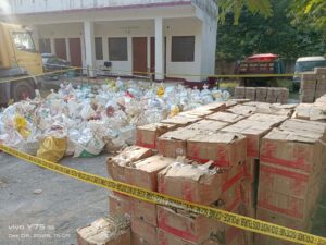 आबकारी विभाग की टीम को मौके पर बुलाकर संयुक्त रूप से जांच की गई, जिसमें *McDowell No.1 एवं Royal Challenge ब्रांड* की शराब की कुल— *326 पेटियाँ + 169 प्लास्टिक बोरियों में कुल 15,669 बोतल, कुल मात्रा 5960.265 लीटर,* बरामद की गई। शराब की अनुमानित कीमत लगभग ₹50 लाख तथा ट्रक की कीमत करीब ₹15 लाख, *कुल ₹65 लाख* आँकी गई।