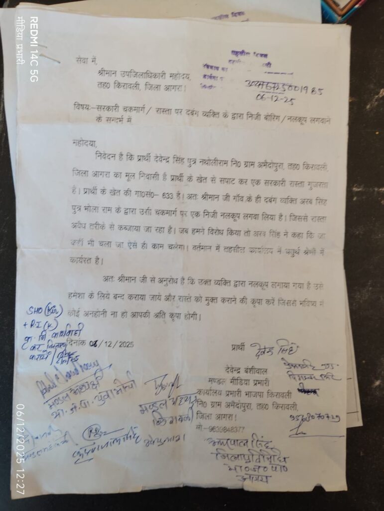 किरावली में चक मार्ग पर अवैध रूप से नल कूप लगाने के संबंध में अधिकारियों को दिया प्रार्थना पत्र