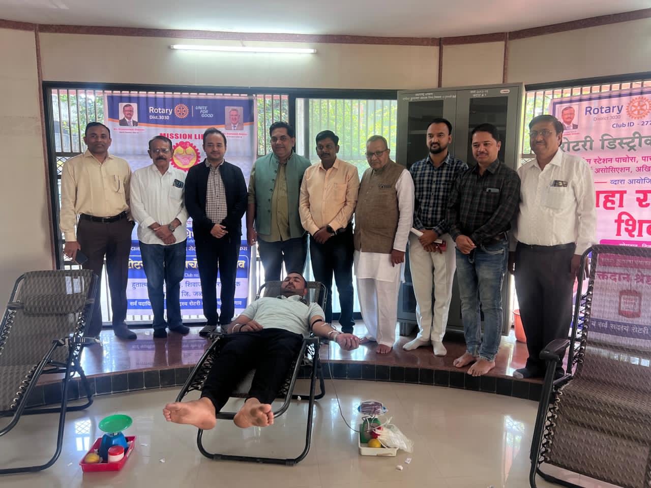 प्रांतपाल ज्ञानेश्वर शेवाळे यांच्या वाढदिवसानिमित्त डिस्ट्रिक्ट 3030 मधील 116 क्लब मध्ये आज एकाचवेळी रक्तदान शिबीर आयोजित करून रोटरीने एक जागतिक कीर्तिमान स्थापित केला. यावेळी एस डी पी ओ रोहम साहेब, तहसीलदार विजय बनसोडे, नगरपालिका मुख्याधिकारी मंगेश देवरे, पोलीस निरीक्षक राहुल पवार, नगरपालिका उपमुख्याधिकारी मराठे, आरोग्य निरीक्षक, नगरपालिका कर्मचारी यासोबत रोटरी क्लब पाचोरा भडगाव अध्यक्ष डॉ मुकेश तेली,सचिव डॉ अजयसिंग परदेशी,रोटरी सदस्य डॉ गोरख महाजन,भरत सिनकर,डॉ प्रशांत सांगडे,डॉ सिद्धांत तेली,डॉ पंकज शिंदे, डॉ शिवाजी शिंदे,संजय कोतकर,प्रज्ञेश खिलोशिया,नितीन तायडे,पिंकी जिनोदिया,चिंतामण पाटील,ज्ञानेश्वर पाचोळे,पुंडलिक पाटील,लक्ष्मण जाधव,गणेश सैंदाणे,चेतन सरोदे,अमोल पाटील यासोबत रेड प्लस ब्लड बँक जळगावचे सदस्य उपस्थित होते.यावेळी 67 रक्तपिशवी रक्तसंकलन केले गेले.सर्व रक्तदाता यांचा 1 लाख रुपये विमा असून सर्व रक्तदाता यांना पाण्याचे जार भेट दिले गेले.अशा रीतीने संपूर्ण रोटरी डिस्ट्रिक्ट3030 मधील 116 क्लब यांनी रक्तदान शिबीर आयोजित करून एक नवा कीर्तिमान स्थापित केला गेला.