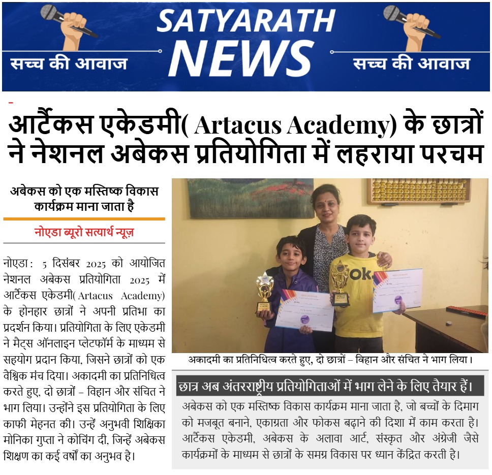 नोएडा : 5 दिसंबर 2025 को आयोजित नेशनल अबेकस प्रतियोगिता 2025 में आर्टैकस एकेडमी( Artacus Academy) के होनहार छात्रों ने अपनी प्रतिभा का प्रदर्शन किया। प्रतियोगिता के लिए एकेडमी ने मैट्स ऑनलाइन प्लेटफॉर्म के माध्यम से सहयोग प्रदान किया, जिसने छात्रों को एक वैश्विक मंच दिया।