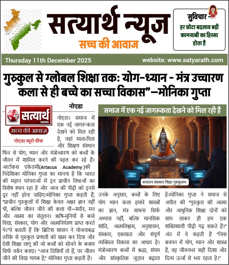 नोएडा। समाज में एक नई जागरूकता देखने को मिल रही है, जहां माता-पिता और शिक्षण संस्थान फिर से योग, ध्यान और मंत्रोच्चारण को बच्चों के जीवन में शामिल करने की पहल कर रहे हैं। आर्टाकस एकेडमी(Artacus Academy )की निदेशिका मोनिका गुप्ता का मानना है कि भारत की महान परंपराओं में इन प्राचीन विधाओं का विशेष स्थान रहा है और आज की पीढ़ी को इनसे दूर नहीं होना चाहिए।