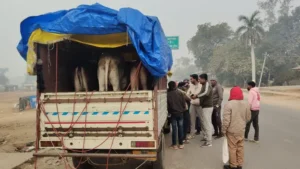 विंढमगंज थाना क्षेत्र में शुक्रवार सुबह गौकशी के उद्देश्य से ले जाई जा रही गायों से भरे दो वाहनों को गौरक्षक सदस्यों और पुलिस की सतर्कता से पकड़ लिया गया। हालांकि दोनों ही मामलों में वाहन चालक मौके का फायदा उठाकर फरार हो गए। पुलिस ने वाहनों को कब्जे में लेकर विधिक कार्रवाई शुरू कर दी है।प्राप्त जानकारी के अनुसार, सुबह करीब 7 बजे एक पिकअप वाहन तेज रफ्तार में विंढमगंज की ओर जा रहा था। वाहन की गतिविधि संदिग्ध प्रतीत होने पर गौरक्षक सदस्य कार्तिक चंद्रवंशी, नीरज कुमार, अजीत शर्मा एवं चंदन पासवान ने बाइक से पीछा कर पिकअप को रुकवाया। वाहन रुकते ही चालक मौके से फरार हो गया। जांच करने पर पिकअप में तीन गाय लदी हुई पाई गईं, जिन्हें झारखंड की ओर ले जाया जा रहा था। घटना की सूचना तत्काल विंढमगंज पुलिस को दी गई।सूचना मिलते ही पुलिस मौके पर पहुंची और पिकअप वाहन को अपने कब्जे में लेते हुए आगे की कार्रवाई शुरू कर दी। इसी क्रम में लगभग एक घंटे बाद गौरक्षक सदस्यों ने एक अन्य वाहन टाटा मैजिक को भी रोका। जांच के दौरान उसमें भी तीन गाय पाई गईं।पकड़ी गई गायों की जांच पशु चिकित्सक डॉ. तरुण रवि द्वारा की गई। जांच रिपोर्ट में बताया गया कि दो गाय दुधारू हैं, एक गाय गर्भवती है, जबकि अन्य गाय सामान्य अवस्था में पाई गईं। प्रारंभिक जांच में गायों को गौकशी के उद्देश्य से ले जाने की आशंका जताई गई है।थाना प्रभारी ने बताया कि गायों से लदे दोनों वाहनों को कब्जे में ले लिया गया है तथा फरार चालकों की तलाश की जा रही है। मामले में संबंधित धाराओं में मुकदमा दर्ज कर विधिक व कानूनी कार्रवाई की जा रही है। पुलिस पूरे मामले की गंभीरता से जांच कर रही है।