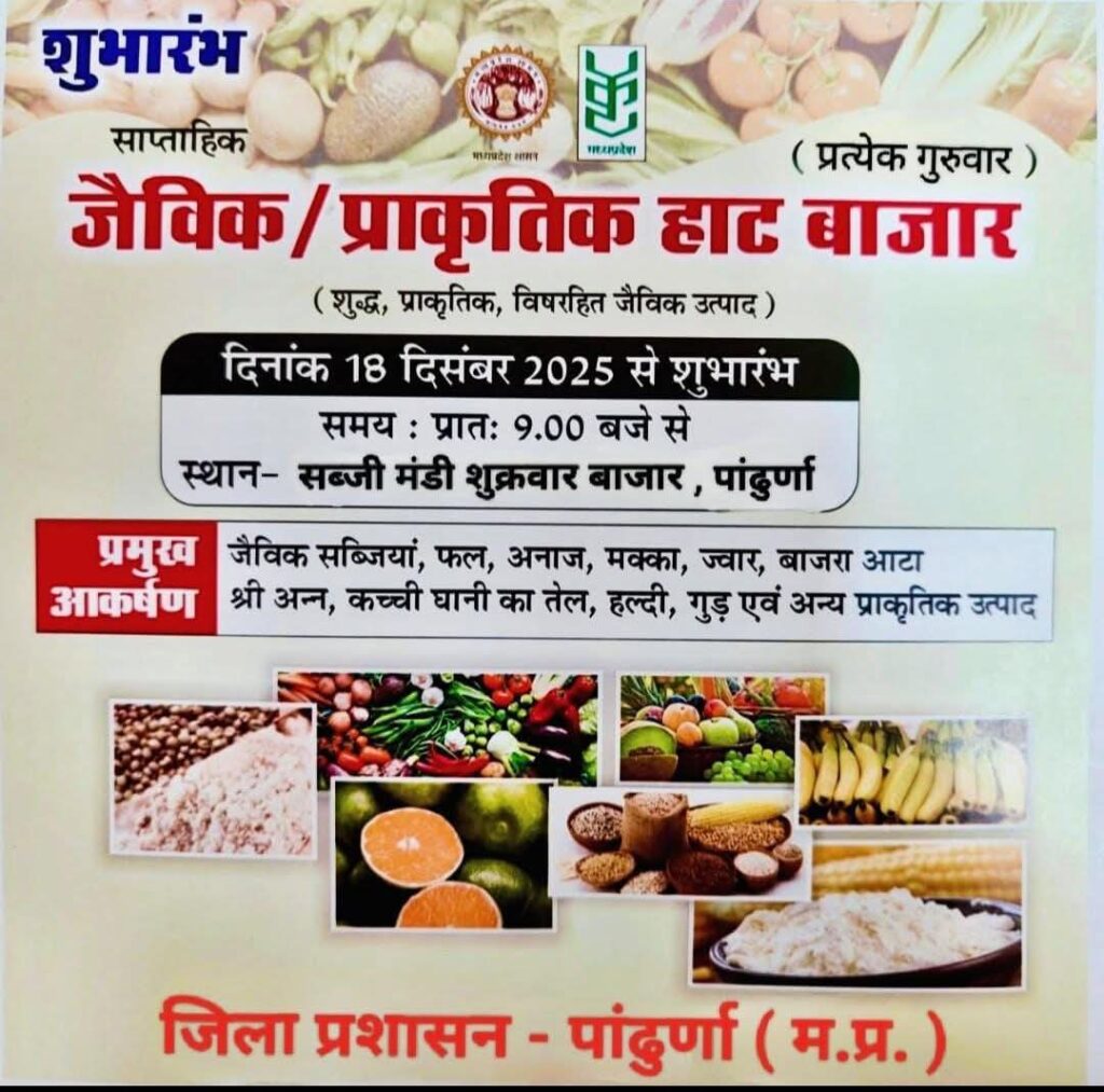 पांढुर्णा – जिला प्रशासन पांढुर्णा के मार्गदर्शन एवं तत्वावधान में नगर में साप्ताहिक जैविक/प्राकृतिक हाट का शुभारंभ 18 दिसंबर 2025 (गुरुवार) से किया जा रहा है। यह हाट प्रत्येक गुरुवार को नियमित रूप से आयोजित की जाएगी।