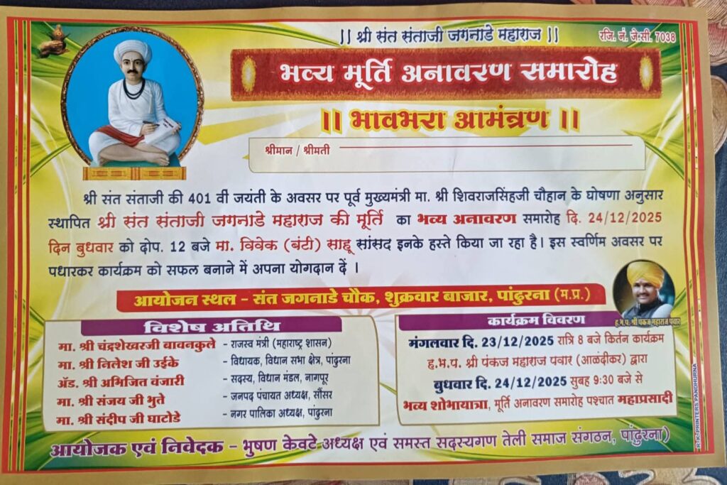 पांढुरना – तेली समाज संगठन पांढुरना द्वारा महान समाज सुधारक एवं प्रेरणास्रोत श्री संत संताजी जगनाडे महाराज की भव्य प्रतिमा का अनावरण समारोह 24 दिसंबर 2025 (बुधवार) को आयोजित किया जाएगा। यह कार्यक्रम नगर के जगनाडे चौक, शुक्रवार बाजार में दोपहर 12 बजे से संपन्न होगा।