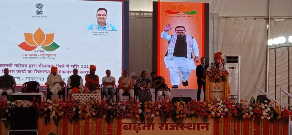 विकास का रथ तेजी से अग्रसर मुख्यमंत्री ने कहा कि हम 5 वर्ष के कार्यकाल में 4 लाख युवाओं को सरकारी नियुक्तियां के लक्ष्य पर प्रतिबद्ध होकर कार्य कर रहे हैं। दो वर्ष में 92 हजार से अधिक पदों पर युवाओं को नियुक्तियां दी गई हैं। वहीं, 1 लाख 53 हजार से अधिक पदों पर भर्ती प्रक्रियाधीन हैं। उन्होंने कहा कि राइजिंग राजस्थान ग्लोबल इन्वेस्टमेंट समिट में 35 लाख करोड़ के एमओयू हस्ताक्षरित हुए, जिनमें से 8 लाख करोड़ से अधिक के प्रोजेक्टस की ग्राउंड ब्रेकिंग हो चुकी है। उन्होंने कहा कि विकास का रथ प्रदेश में तेजी से आगे बढ़ रहा है। प्रदेश की अर्थव्यवस्था को बढ़ावा देने के लिए 28 नवीन नीतियां जारी की गई हैं। जीएसएस, स्वास्थ्य केंद्र, महाविद्यालय सहित विभिन्न कार्यों का लोकार्पण शर्मा ने इस दौरान भीलवाड़ा में 322 करोड़ रुपये से अधिक राशि के 30 विकास कार्यों का लोकार्पण एवं शिलान्यास किया। उन्होंने कहा कि इनमें से 22 करोड़ रुपये से अधिक की राशि के जीएसएस, स्वास्थ्य केंद्र, लैब, विद्यालय, महाविद्यालय और उप तहसील कार्यालय से जुड़े विकास कार्यों का लोकार्पण किया गया है। वहीं, 300 करोड़ रुपये से अधिक राशि के विकास कार्यों की नींव रखी गई है। उन्होंने कहा कि राज्य सरकार ने दो वर्ष में भीलवाड़ा जिले में 2 हजार 900 करोड़ रुपये से अधिक के करीब 50 हजार कार्य किए हैं। विभिन्न योजनाओं के तहत जिले के निवासियों को 4 हजार करोड़ रुपये से अधिक राशि डीबीटी के माध्यम से अंतरित की गई है।2 साल के हमारे काम गत सरकार के 5 साल से ज्यादा शर्मा ने कहा कि हमारी सरकार ने केवल 2 वर्षों में गत सरकार के 5 वर्षों से ज्यादा काम किया है। हमारी सरकार ने दो साल में प्रदेश की बिजली उत्पादन क्षमता में 6 हजार 363 मेगावाट क्षमता की वृद्धि की है जबकि गत सरकार ने 5 साल में सिर्फ 3 हजार 952 मेगावाट क्षमता की ही बढ़ोत्तरी की। उन्होंने कहा कि हमने गौशालाओं को दो साल में 3 हजार 433 करोड़ रुपये की सहायता दी, जबकि गत सरकार पूरे 5 साल में केवल 3 हजार 117 करोड़ रुपये की राशि ही दे सकी। इसी प्रकार, हमारी सरकार ने 2 साल में 1 हजार 640 गांवों को सड़कों से जोड़ा है, जबकि पूर्ववर्ती सरकार 5 साल में केवल 1 हजार 100 गांवों को ही सड़कों से जोड़ पाई थी। 296 भर्ती परीक्षाएं पारदर्शिता के साथ आयोजित मुख्यमंत्री ने कहा कि राज्य सरकार भ्रष्टाचार के विरूद्ध सख्त कार्रवाई कर रही है। लगभग 200 कार्मिकों को अनुशासनहीनता सहित विभिन्न प्रकरणों में निलंबित किया गया है तथा 34 मामलों में अभियोजन की स्वीकृति दी जा चुकी है। उन्होंने कहा कि पूर्ववर्ती सरकार के दौरान पेपरलीक के मामलों में 138 एफआईआर दर्ज कर कुल 394 आरोपियों को गिरफ्तार किया जा चुका है। हमारे कार्यकाल में 296 भर्तियां बिना पेपरलीक के पारदर्शी तरीके से आ