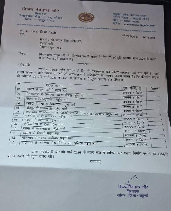 पांढुर्णा। जिला कलेक्टर कार्यालय पांढुर्णा के सभाकक्ष में आयोजित जिला विकास सलाहकार समिति की प्रथम बैठक में जिला पांढुर्णा के प्रभारी मंत्री माननीय श्री प्रद्युम्न सिंह तोमर जी के समक्ष सौसर विकासखंड के ग्रामीण अंचलों की सड़कों, पुल–पुलियों के निर्माण कार्यों को स्वीकृति प्रदान कर आगामी बजट 2026 में शामिल करने हेतु सौसर विधायक श्री विजय चौरे द्वारा विस्तृत प्रस्ताव प्रस्तुत किए गए।