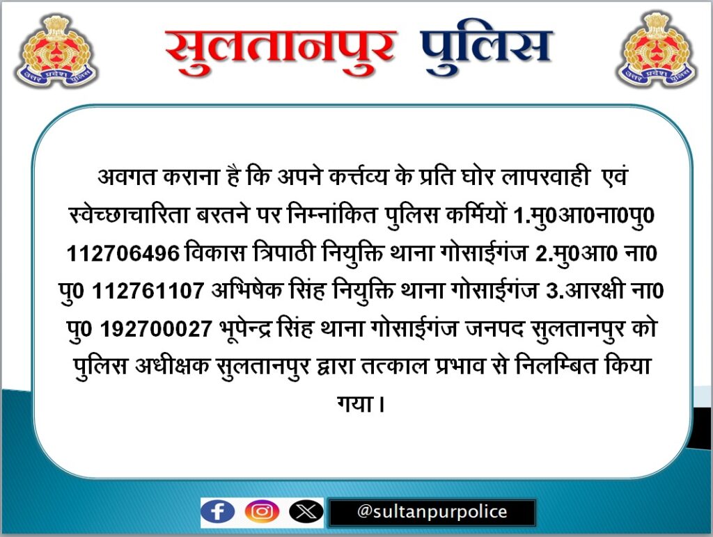 3.आरक्षी ना0 पु0 192700027 भूपेन्द्र सिंह थाना गोसाईगंज जनपद सुलतानपुर को पुलिस अधीक्षक सुलतानपुर द्वारा तत्काल प्रभाव से निलम्बित किया गया ।