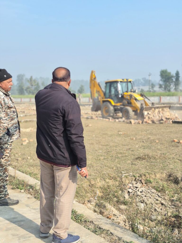 अवैध प्लाटिंग पर गरजा प्राधिकरण का जेसीबी। लगभग पच्चीस हजार वर्गमीटर भूमि पर प्रस्तावित कालोनी की दीवार ध्वस्त की गई।