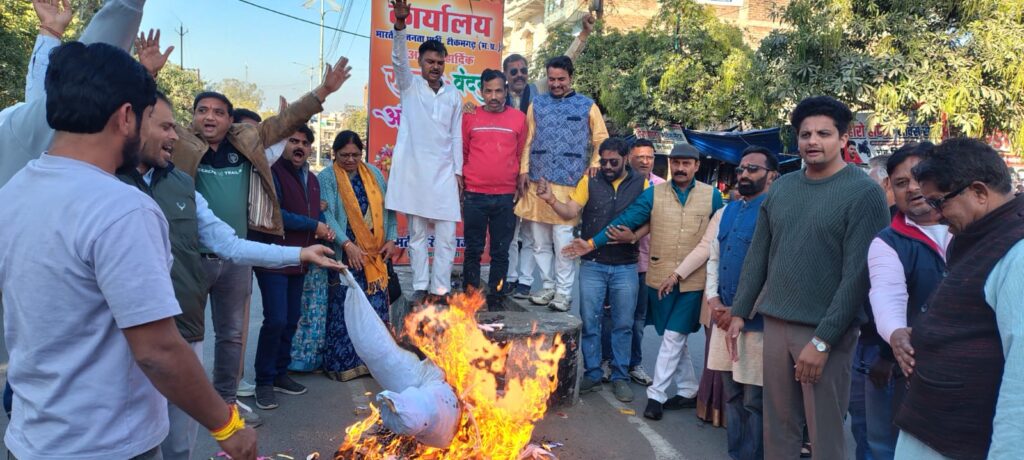 महिलाओं के सम्मान में भाजपाईयों ने जलाया कांग्रेस विधायक फूल सिंह बरैया का पुतला।