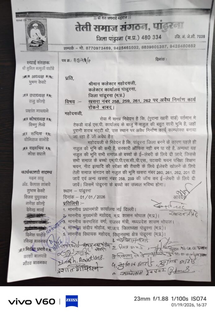 पांढुरना – तेली समाज संगठन, पांढुरना द्वारा अध्यक्ष भूषण केवटे के नेतृत्व में अन्य वरिष्ठ सामाजिक बंधुओं की उपस्थिति में कलेक्टर महोदय को एक ज्ञापन सौंपकर टेकड़ी वार्ड स्थित एस.पी. कार्यालय के समीप नजुल भूमि पर हो रहे कथित अवैध निर्माण कार्य को तत्काल रोकने की मांग की गई है। ज्ञापन में खसरा नंबर 258, 259, 261 एवं 262 की नजुल भूमि पर नियम विरुद्ध निर्माण किए जाने का उल्लेख करते हुए प्रशासन से सख्त कार्रवाई की अपील की गई है।
