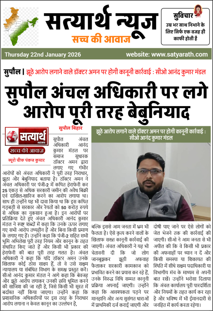 सुपौल अंचल अधिकारी आनंद कुमार मंडल पर समाज सुधारक डॉक्टर अमन द्वारा लगाए गए गंभीर आरोपों को अंचल अधिकारी ने पूरी तरह निराधार, झूठा और बेबुनियाद बताया है। डॉक्टर अमन ने अंचल अधिकारी पर पंजी-2 में कथित हेराफेरी कर 25 एकड़ से अधिक सरकारी जमीन की अवैध बिक्री एवं दाखिल-खारिज करने का आरोप लगाया था। साथ ही उन्होंने यह भी दावा किया था कि इस कथित गड़बड़ी से सरकार और रैयतों को 50 करोड़ रुपये से अधिक का नुकसान हुआ है।
