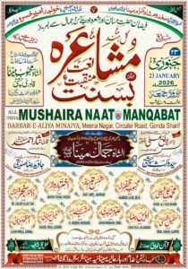 गोंडा पूर्वी भारत की प्रसिद्ध खानकाह दरबारे आलिया मीनाईया, मीना नगर कर्बला रोड, गोंडा में हज़रत अमीर खुसरो र0अ0 एवं हज़रत शाह महबूब मीना अ0र0 की याद में 23 जनवरी को भव्य ऑल इंडिया नातिया मुशायरा का आयोजन किया जाएगा।