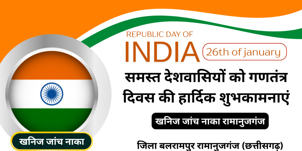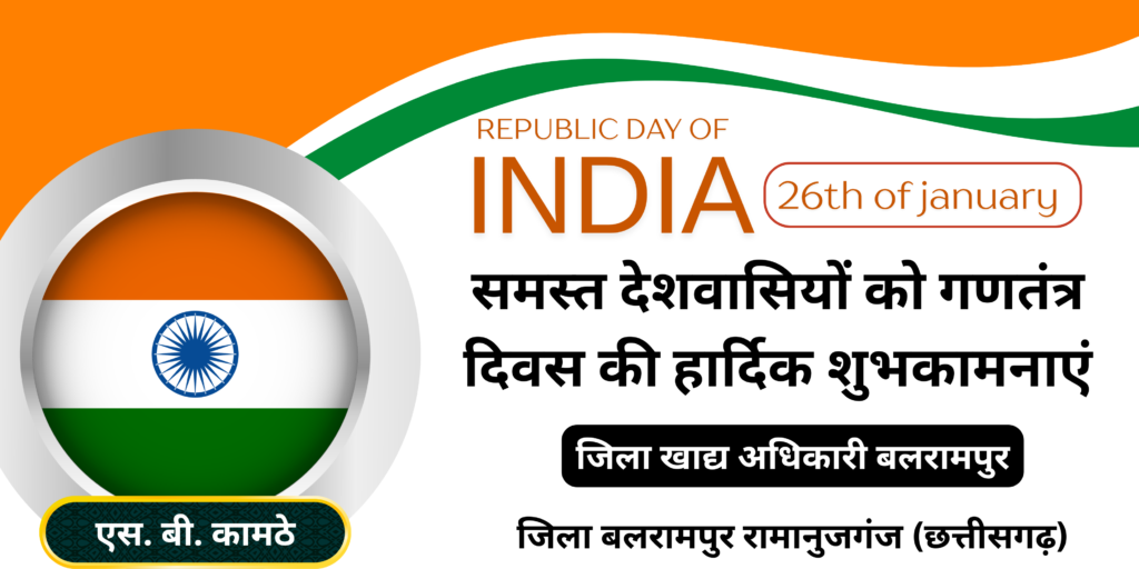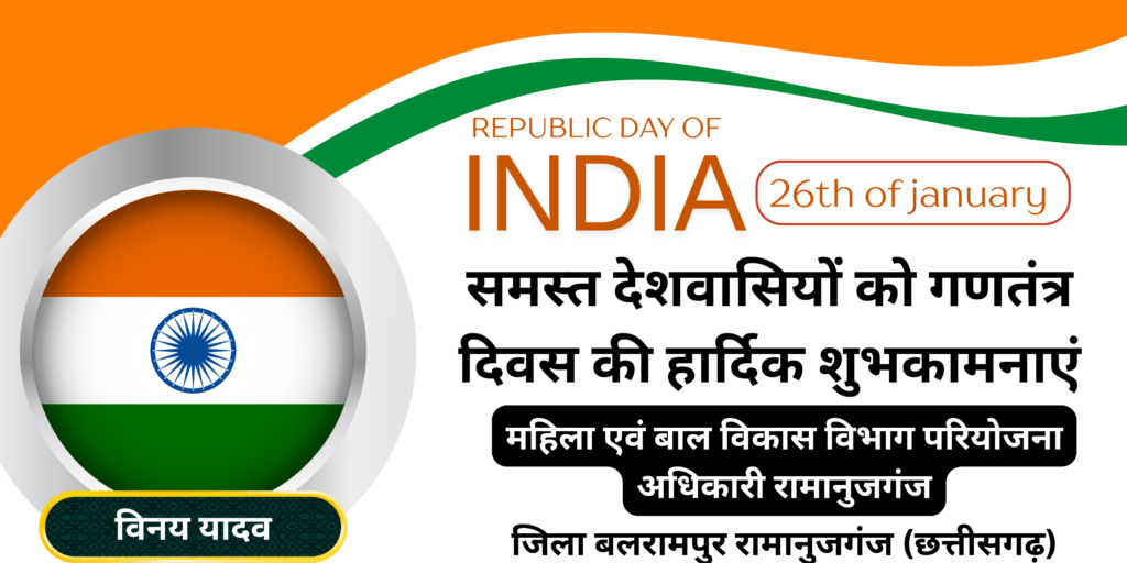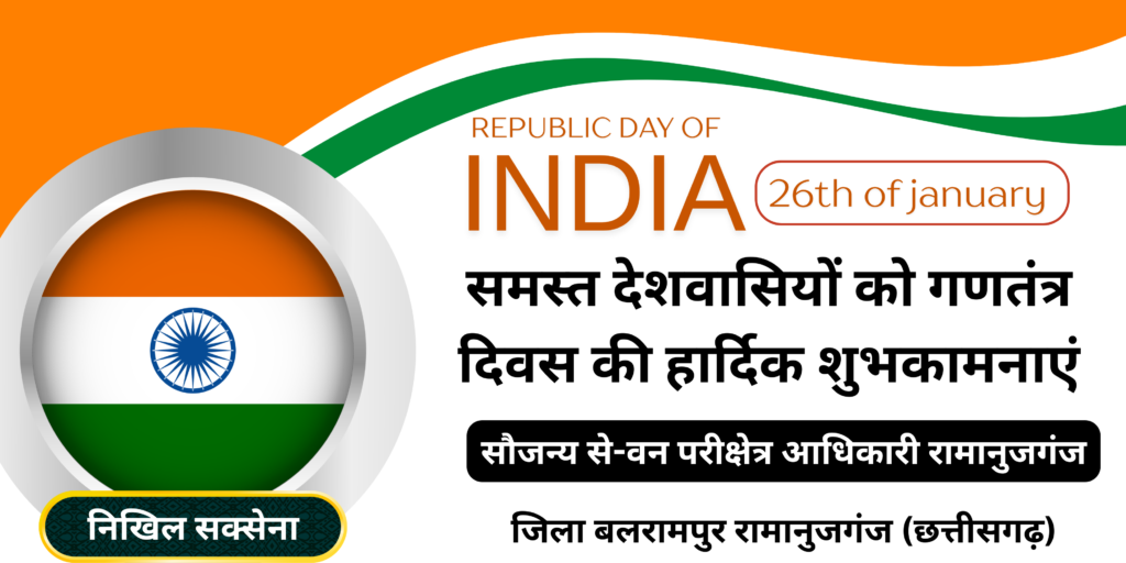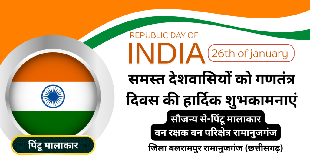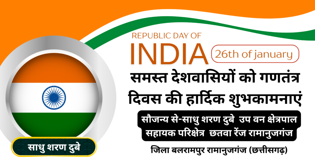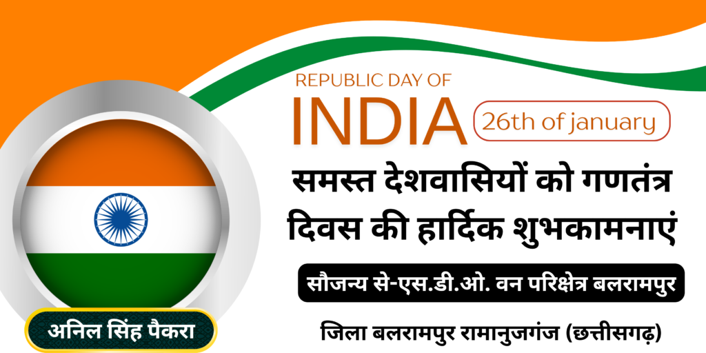 छत्तीसगढ़ बलरामपुर वन विभाग के समस्त टीम की तरफ से गणतंत्र दिवस की हार्दिक शुभकामनाएं Satyarath Jan 26, 2026 0 वन विभाग के समस्त टीम की तरफ से गणतंत्र दिवस की हार्दिक शुभकामनाएं छत्तीसगढ़ ब्यूरो नवीन तिवारी Spread the love