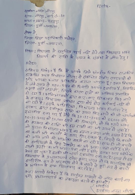पूर्वी चंपारण, 27 जनवरी 2026 – नीरपुर ग्राम के राजकीय उत्क्रमित मध्य विद्यालय में पढ़ाई की दयनीय स्थिति और भवन निर्माण की राशि के गबन को लेकर ग्रामीणों ने जिला शिक्षा पदाधिकारी से जांच की मांग की है।
