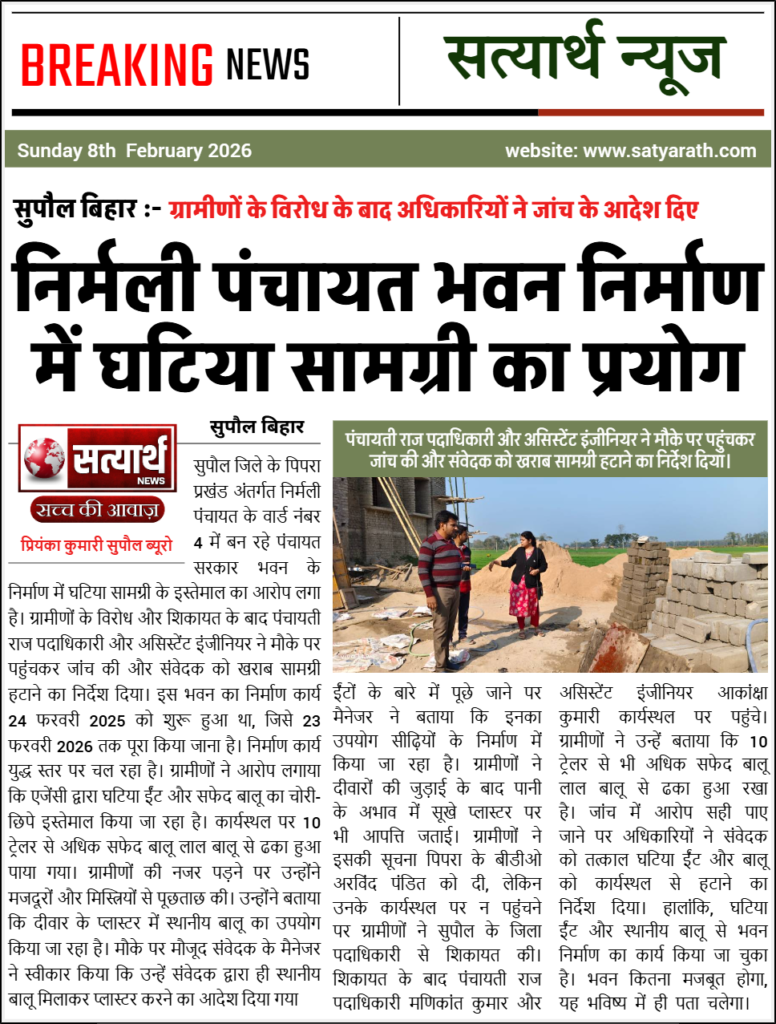 सुपौल जिले के पिपरा प्रखंड अंतर्गत निर्मली पंचायत के वार्ड नंबर 4 में बन रहे पंचायत सरकार भवन के निर्माण में घटिया सामग्री के इस्तेमाल का आरोप लगा है। ग्रामीणों के विरोध और शिकायत के बाद पंचायती राज पदाधिकारी और असिस्टेंट इंजीनियर ने मौके पर पहुंचकर जांच की और संवेदक को खराब सामग्री हटाने का निर्देश दिया।