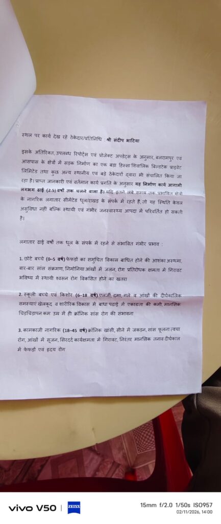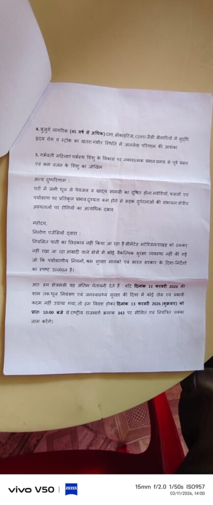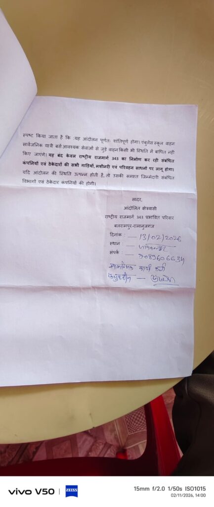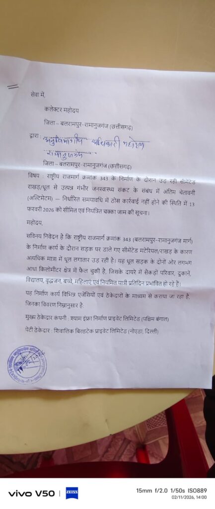 राष्ट्रीय राजमार्ग क्रमांक 343 (बलरामपुर–रामानुजगंज मार्ग) के निर्माण के दौरान लगातार उड़ रही सीमेंटेड राखड़ एवं धूल से उत्पन्न गंभीर जनस्वास्थ्य संकट के विरोध में लगभग 500 से अधिक स्थानीय नागरिकों द्वारा दिनांक 13 फरवरी 2026 (शुक्रवार) को सुबह 10:00 बजे से सीमित एवं नियंत्रित चक्का जाम किया जाएगा।