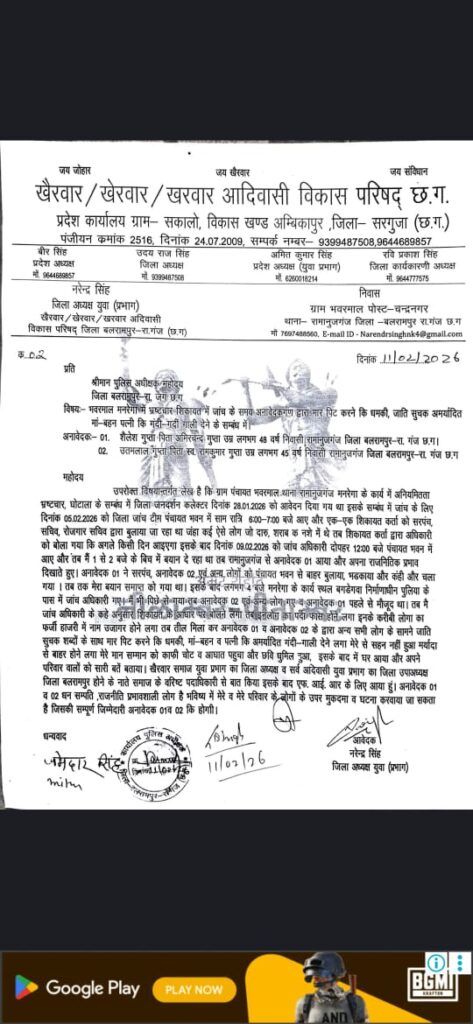 बलरामपुर (रामानुजगंज) ग्राम पंचायत भवरमाल, में मनरेगा कार्यों में कथित भ्रष्टाचार की शिकायत के बाद जांच के दौरान मारपीट, गाली-गलौज और जान से मारने की धमकी दिए जाने का मामला सामने आया है। खेरवार आदिवासी विकास परिषद, जिला बलरामपुर-(रामानुजगंज )की ओर से इस संबंध में पुलिस अधीक्षक बलरामपुर को लिखित शिकायत करते हुए आरोपियों के खिलाफ एफआईआर दर्ज करने की मांग की गई है.