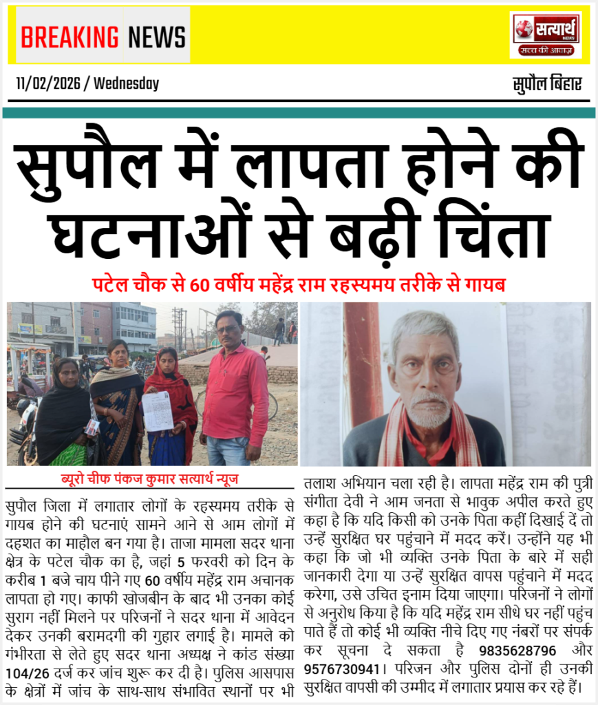 सुपौल में लापता होने की घटनाओं से बढ़ी चिंता, पटेल चौक से 60 वर्षीय महेंद्र राम रहस्यमय तरीके से गायब