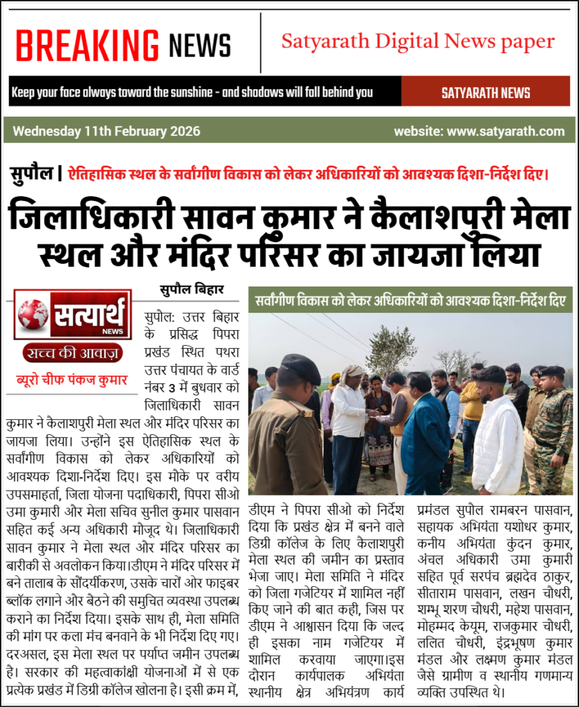 सुपौल: उत्तर बिहार के प्रसिद्ध पिपरा प्रखंड स्थित पथरा उत्तर पंचायत के वार्ड नंबर 3 में बुधवार को जिलाधिकारी सावन कुमार ने कैलाशपुरी मेला स्थल और मंदिर परिसर का जायजा लिया। उन्होंने इस ऐतिहासिक स्थल के सर्वांगीण विकास को लेकर अधिकारियों को आवश्यक दिशा-निर्देश दिए।