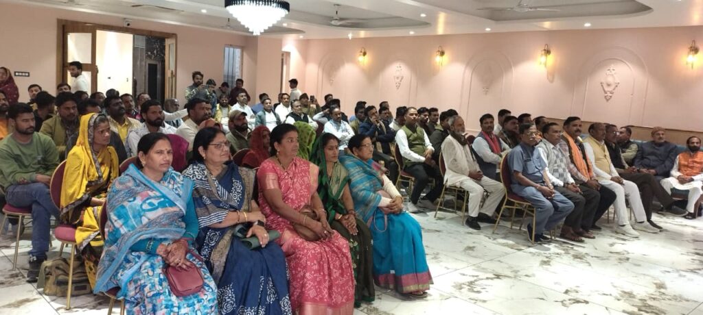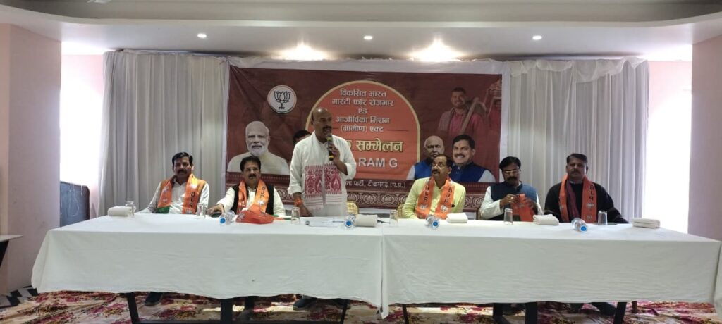 टीकमगढ़।आज स्थानीय होटल परिसर में VB-GRAMG पर ब्लॉक सम्मेलन हुआ। भाजपा मीडिया प्रभारी स्वप्निल तिवारी ने बताया कि केंद्रीय मंत्री डॉ वीरेंद्र कुमार की मुख्य उपस्थिति में विकसित भारत – गारंटी का रोजगार एवं आजीविका मिशन ग्रामीण एक्ट VB-GRAMG पर टीकमगढ़ ब्लॉक का सम्मेलन स्थानीय होटल परिसर में किया गया,मंच पर केंद्रीय मंत्री डॉ वीरेंद्र कुमार के साथ वरिष्ठ नेता विवेक चतुर्वेदी, सांसद प्रतिनिधि अनुराग वर्मा, किसान मोर्चा जिलाध्यक्ष व जिला कार्यक्रम प्रभारी किशन पटेरिया, विधानसभा कार्यक्रम प्रभारी प्रफुल्ल द्विवेदी , मंडल अध्यक्ष नरेश तिवारी, जिला सह कार्यक्रम प्रभारी एवं संचालनकर्ता अंशुल व्यास उपस्थित रहे। कार्यक्रम की शुरुआत में भारत माता के चित्र पर पुष्पांजलि व दीप प्रज्ज्वलित कर हुई। बड़ी संख्या में भाजपा पदाधिकारी, कार्यकर्ता