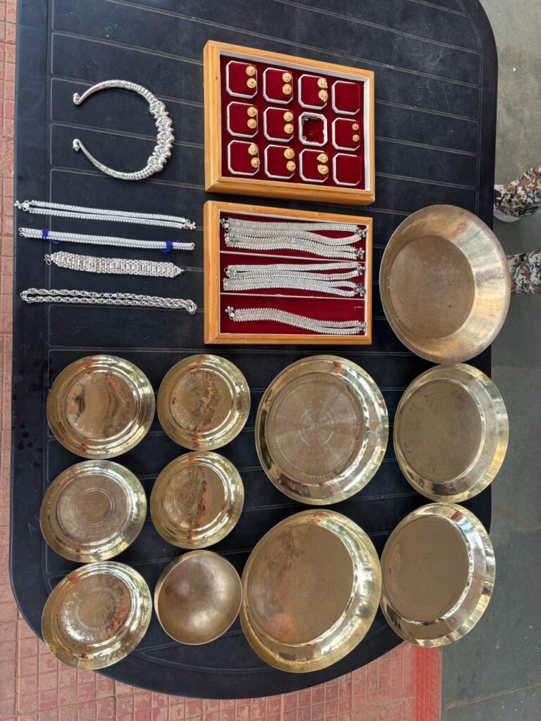 पुलिस ने आरोपी के पास से कांसा की थाली, प्लेट, कटोरा, चांदी का ब्रेसलेट, चांदी की चेन, चांदी की पायल तथा गिल्ट के टॉप्स सहित अन्य सामान बरामद किया है।