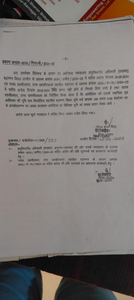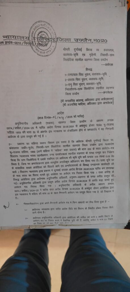 महिला दुर्गाबाई व अनावेदकगण के मध्य स्वत्व का विवाद मानते हुए दिनांक 28.02.2024 को आवेदिका का आवेदन निरस्त कर दिया। जिसकी अपील आवेदिक का द्वारा अनु विभागीय अधिकारी बड़नगर के न्यायालय में की लेकिन अनु विभागीय अधिकारी बड़नगर ने दिनांक 30.8.2024 को अपील अवधि बाहर मानते हुए निरस्त की गई। जिसके विरुद्ध आवेदीका द्वारा कलेक्टर उज्जैन के समक्ष एक निगरानी प्रस्तुत की थी जिसमें सभी पक्षों को सुनने के बाद कलेक्टर द्वारा दिनांक 1.4.2025 को आदेश पारित करते हुए स्पष्ट रूप से कहा है कि अधीनस्थ न्यायालय अनु विभागीय अधिकारी बड़नगर के प्रकरण क्रमांक 0074/ अपील/2024-25 आदेश दिनांक 30.08.2024 एवं नायब तहसीलदार टप्पा खरसोद कला के प्रकरण क्रमांक 0003/अ-70/2024-25 आदेश दिनांक 28.2.2024 विधि संगत नहीं होने से निरस्त किए जाते हैं तथा नायब तहसीलदार टप्पा खरसोद कला को निर्देशित किया जाता है की आवेदीका को उसके स्वामित्व एवं आधिपत्य की भूमि ग्राम सिलोदिया तहसील बड़नगर स्थित भूमि सर्वे नंबर 169 रबकबा 0.09 हेक्टेयर पर से अनावेदकगण का कब्जा हटवा कर आवेदीका को विधिवत भूमि का कब्जा प्रदान किया जावे। कलेक्टर को आदेश पारित किया लगभग 1 वर्ष होने को आया है लेकिन उनके आदेश का पालन अभी तक नहीं हुआ है
