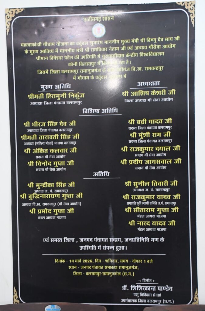 बलरामपुर, 14 मार्च 2026/ निराश्रित एवं घुमंतू गौवंशीय पशुओं के संरक्षण, संवर्धन तथा उनके समुचित देखभाल की व्यवस्था सुनिश्चित करने के उद्देश्य से राज्य शासन द्वारा गौधाम योजना की शुरुआत की गई है। इस योजना के माध्यम से गौवंशीय पशुओं को सुरक्षित आश्रय प्रदान करने के साथ ही वैज्ञानिक पद्धति से उनके संरक्षण और प्रबंधन की दिशा में प्रभावी पहल की जा रही है।