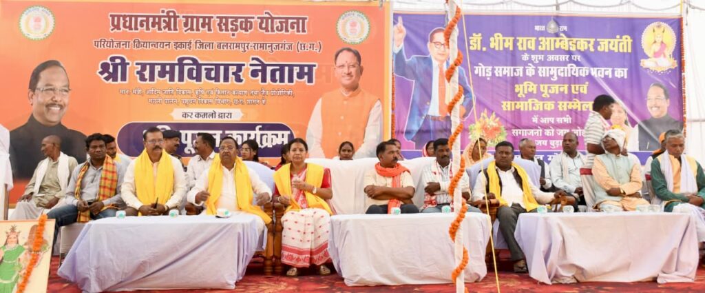 संविधान निर्माता भारत रत्न डॉ. भीमराव अंबेडकर की जयंती के अवसर पर आयोजित कार्यक्रम में मंत्री रामविचार नेताम ने सेवा जोहार के साथ जनसमुदाय को संबोधित करते हुए गोंडवाना समाज को बधाई एवं शुभकामनाएं दीं। उन्होंने कहा कि समाज की मांग को पूरा करते हुए सामाजिक भवन के निर्माण का शिलान्यास किया गया है, जिससे सामाजिक गतिविधियों को बढ़ावा मिलेगा।