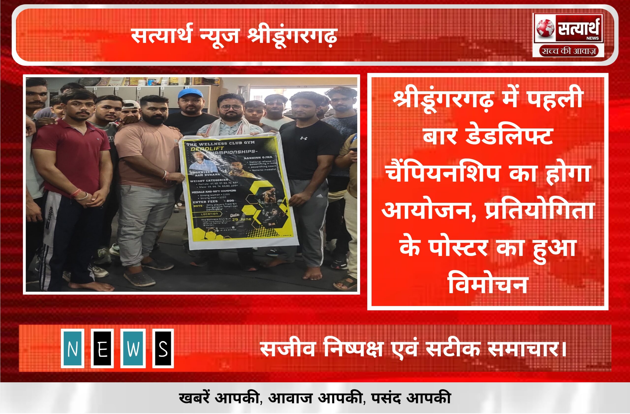 सत्यार्थ न्यूज श्रीडूंगरगढ़-सवांददाता ब्यूरो चीफ श्रीडूंगरगढ़ के इतिहास में पहली बार वेलनेस जिम के तत्वावधान में 29 जून को डेडलिफ्ट…