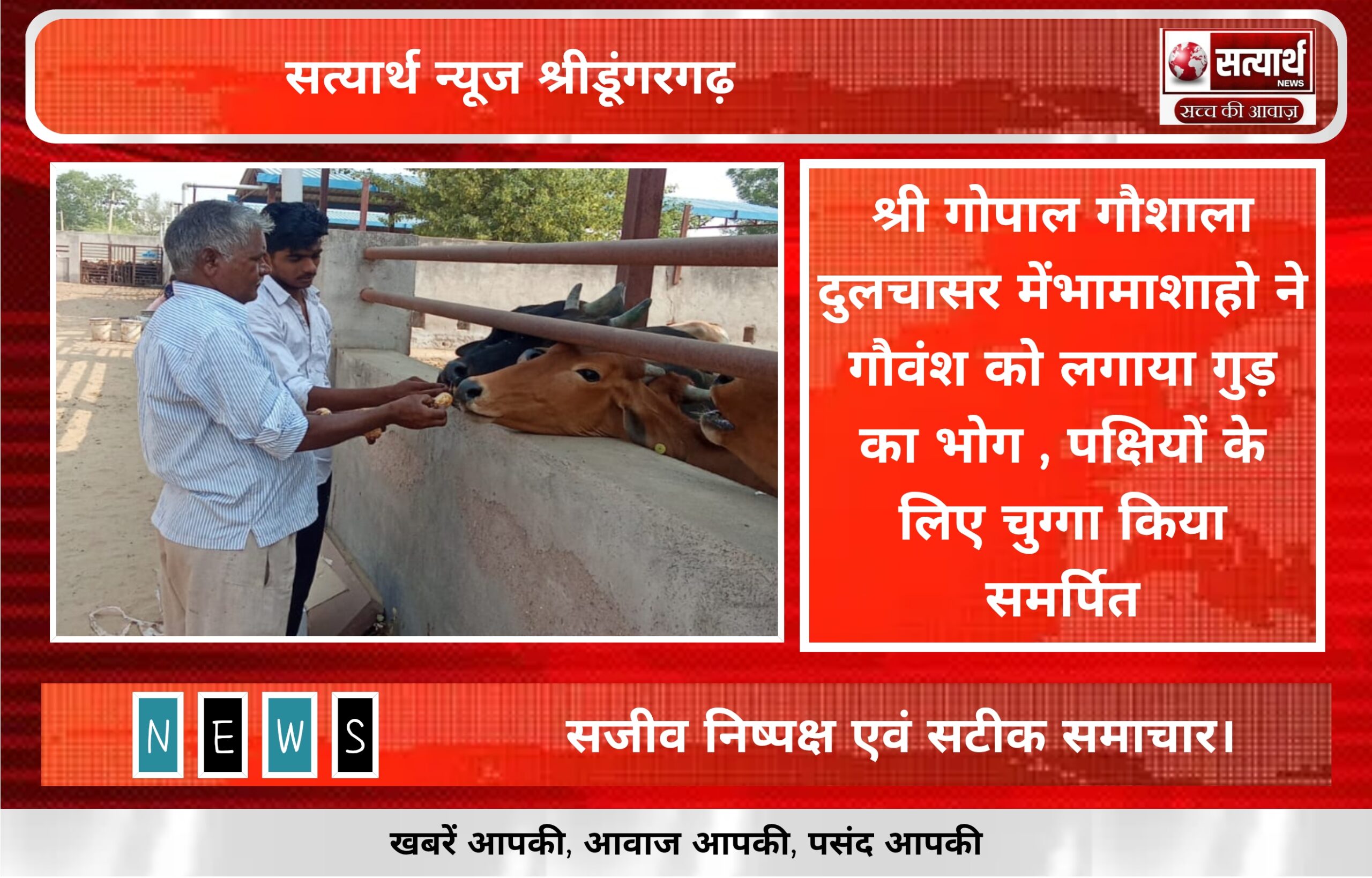 सत्यार्थ न्यूज श्रीडूंगरगढ़- सवांददाता ब्यूरो चीफ श्री गोपाल गौशाला दुलचासर में आज गोभक्त भामाशाह मालाराम सुथार अपने परिवार सहित गोशाला…