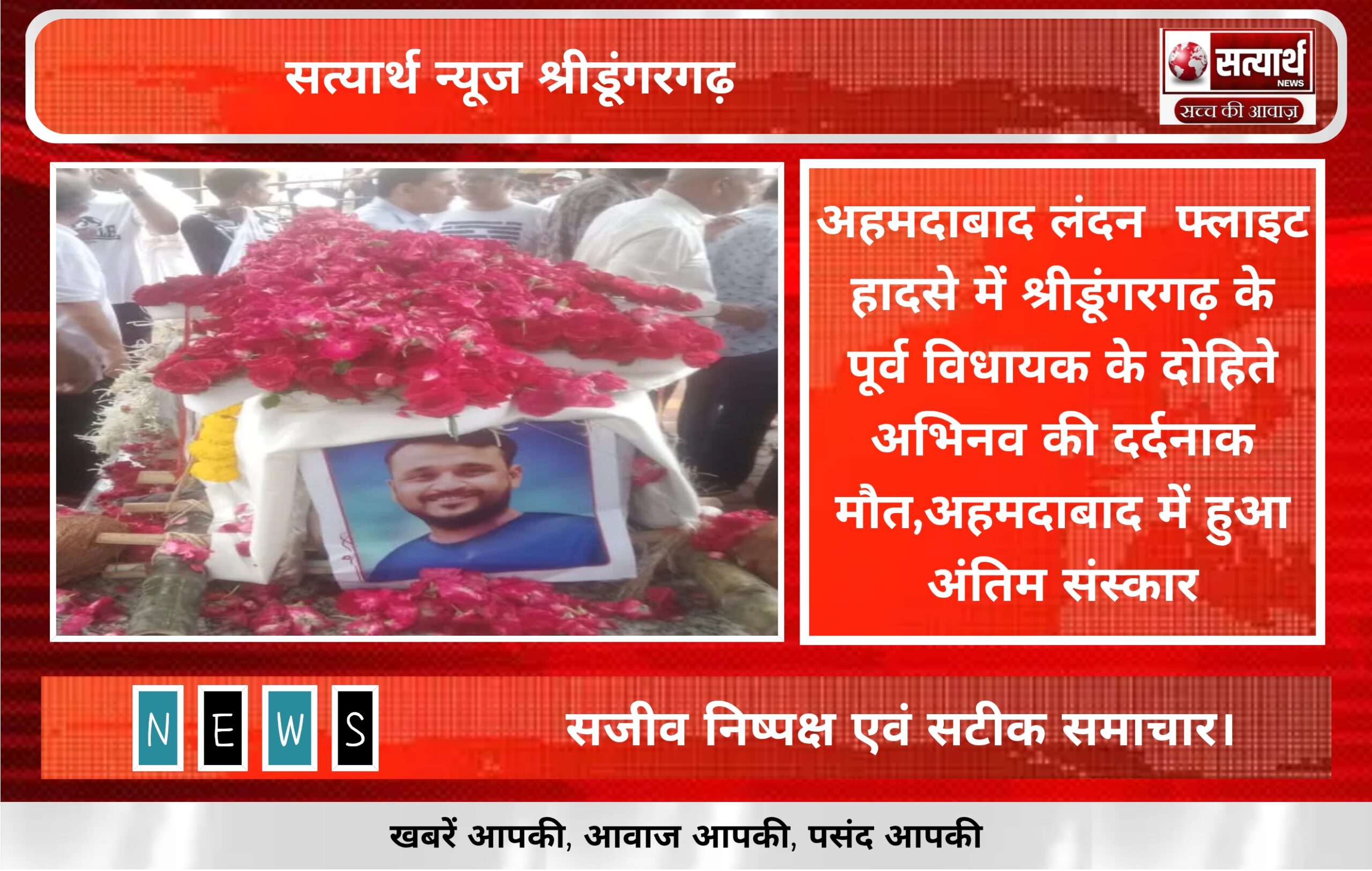 सत्यार्थ न्यूज श्रीडूंगरगढ़-सवांददाता ब्यूरो चीफ एयर इंडिया की अहमदाबाद-लंदन फ्लाइट हादसे में बीकानेर के अभिनव पड़िहार की दर्दनाक मौत ने…