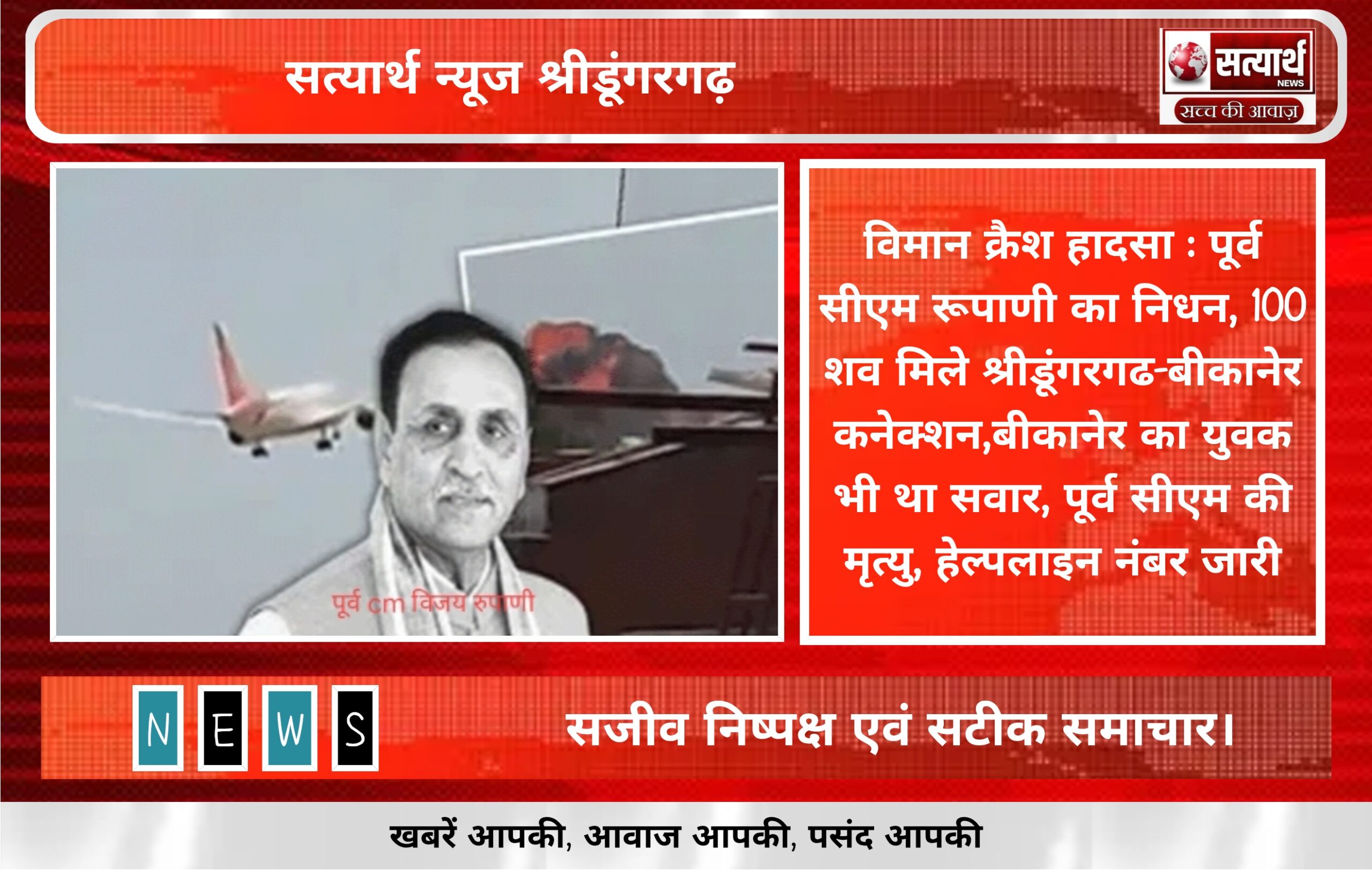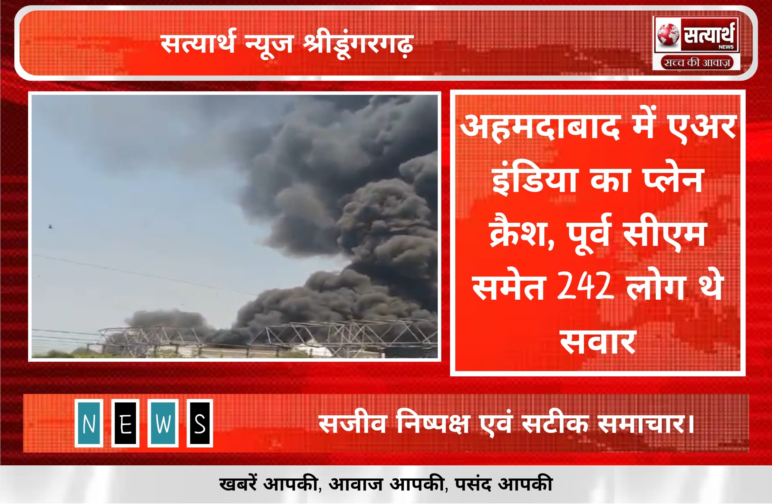 सत्यार्थ न्यूज श्रीडूंगरगढ़-सवांददाता ब्यूरो चीफ अहमदाबाद में एअर इंडिया का बोइंग 787 ड्रीमलाइनर प्लेन क्रैश हुआ है। इसमें गुजरात के…