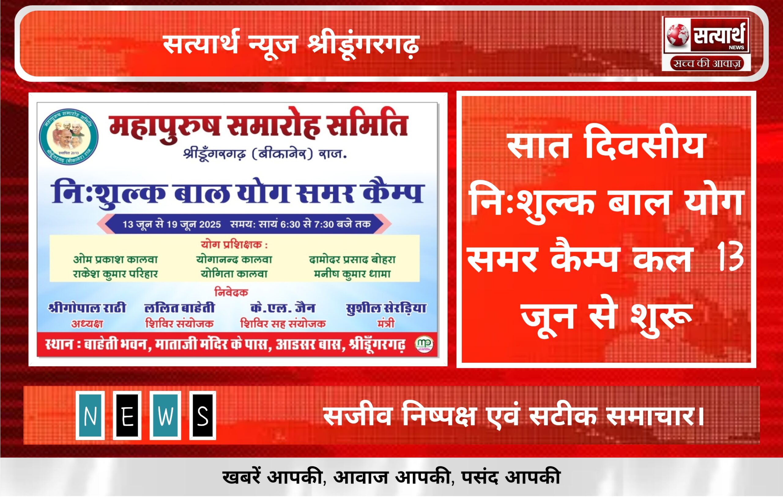 सत्यार्थ न्यूज श्रीडूंगरगढ़-सवांददाता ब्यूरो चीफ महापुरुष समारोह समिति श्रीडूंगरगढ़ के तत्वावधान में ग्रीष्मकालीन छुटियों में बच्चों हेतु बाल योग समर…