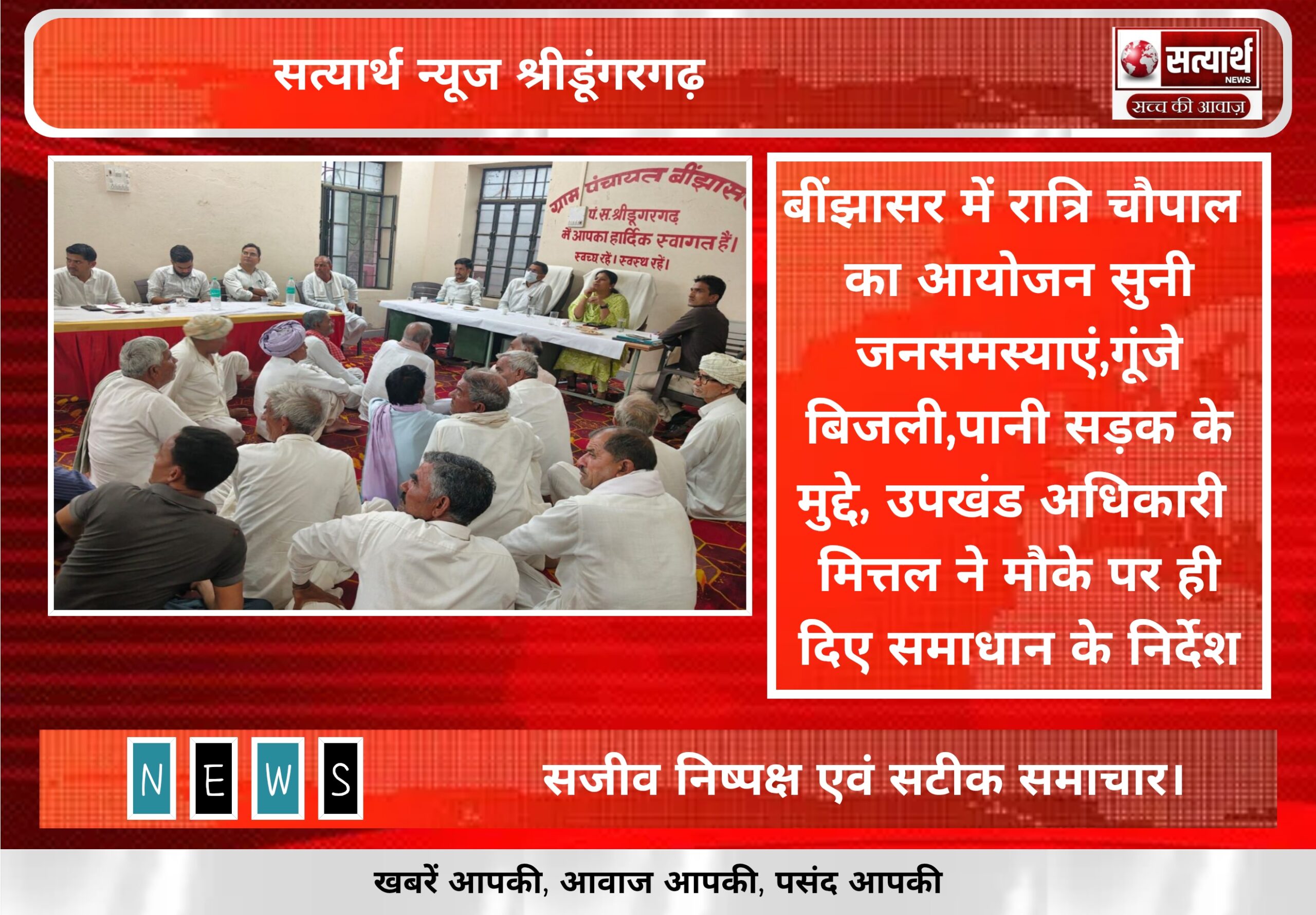 सत्यार्थ न्यूज श्रीडूंगरगढ़-सवांददाता ब्यूरो चीफ ग्राम पंचायत बींझासर में मंगलवार रात उपखंड अधिकारी उमा मित्तल की अध्यक्षता में रात्रि चौपाल…