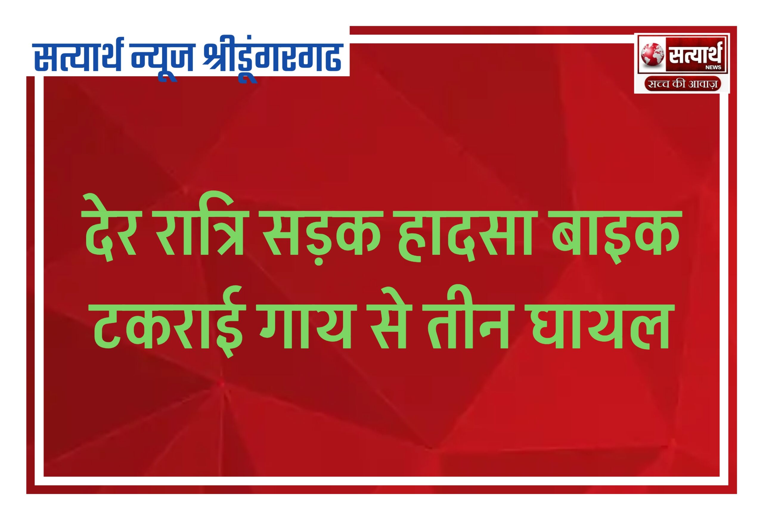 सत्यार्थ न्यूज श्रीडूंगरगढ़-सवांददाता ब्यूरो चीफ देर रात्रि नेशनल हाइवे पर बिग्गा के पास एक बाइक गाय से टकराई गई जिसमें…