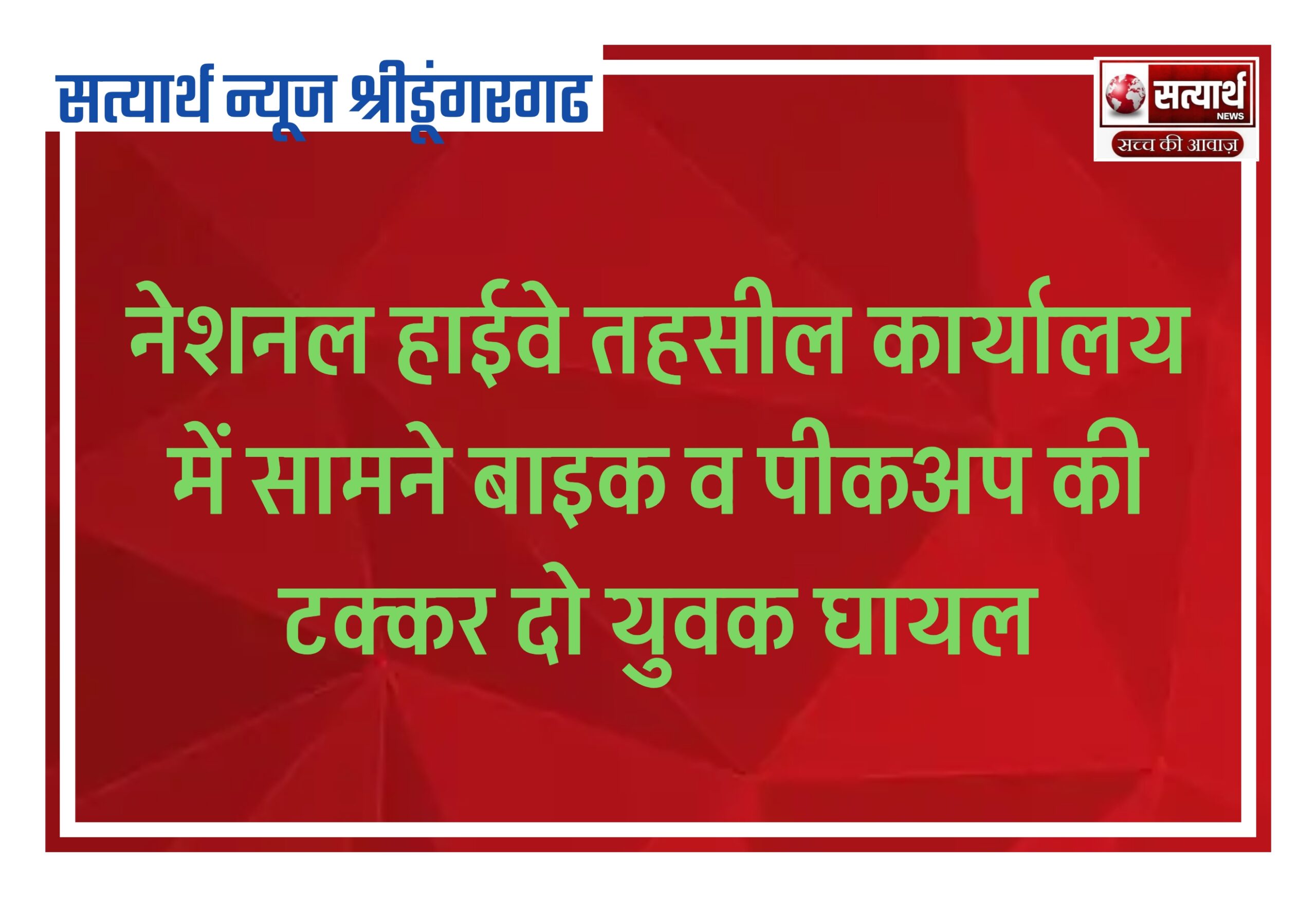 सत्यार्थ न्यूज श्रीडूंगरगढ़-सवांददाता ब्यूरो चीफ श्रीडूंगरगढ़ नेशनल हाईवे पर तहसील के सामने अभी कुछ देर पहले बाइक व पिकअप की…